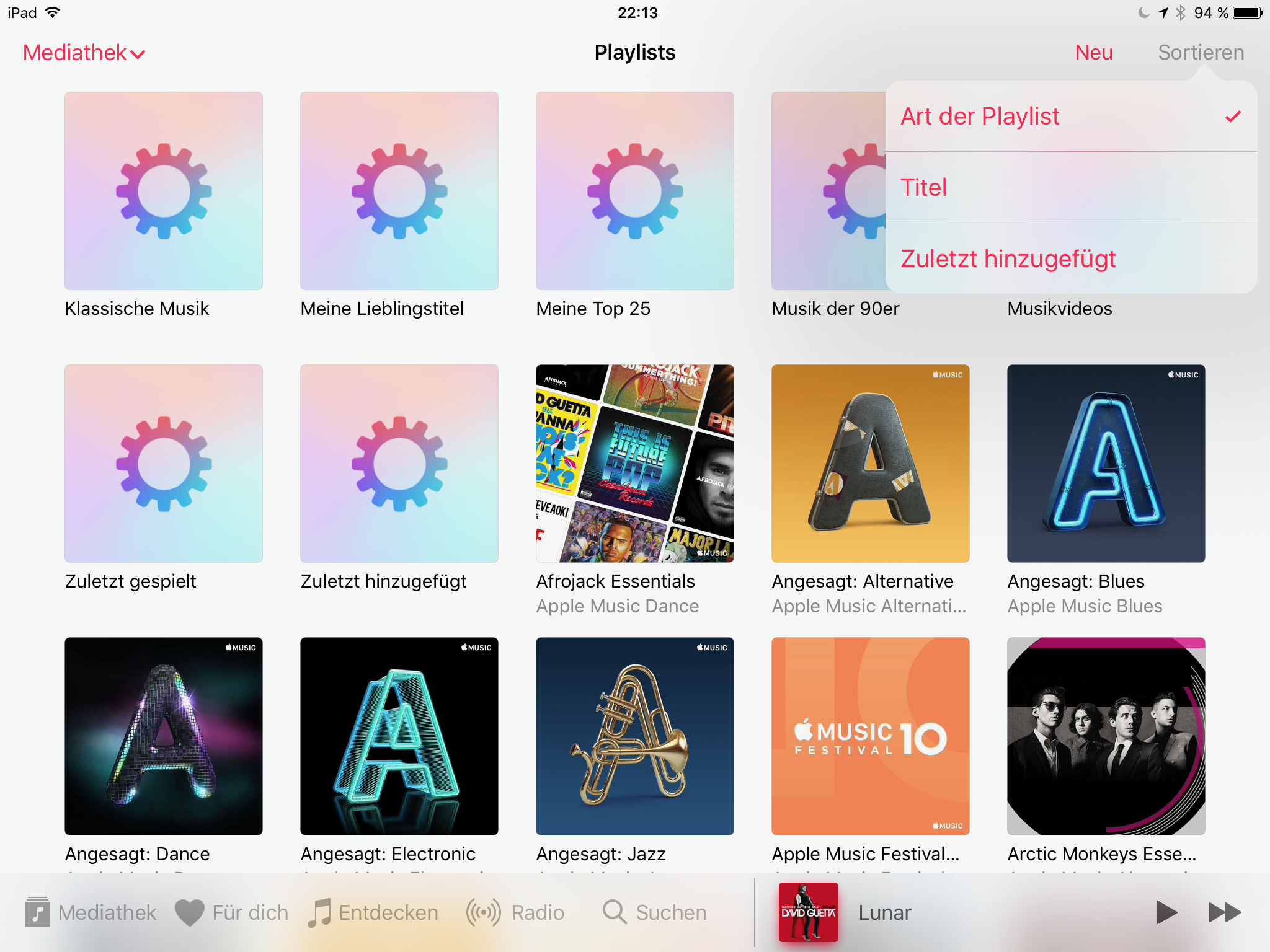 Playlists can be sorted by type, name or recently added. Albums by title or artists.