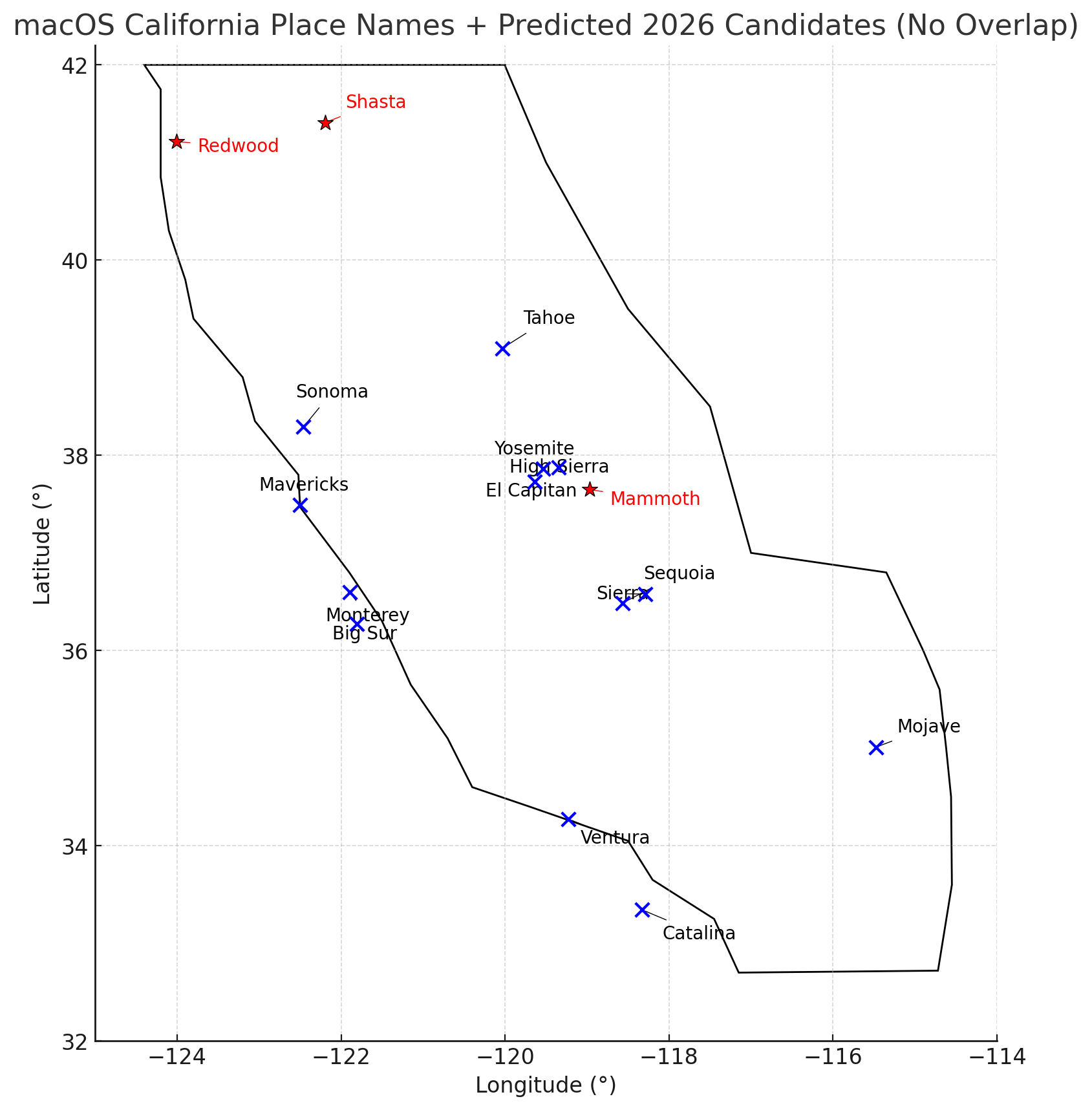 Feels like Apple’s boxed itself into a weird little California tourist brochure. Meanwhile, there are still a dozen cool big cat names they never used. Imagine macOS Lynx, Ocelot, or even Jaguar 2.0. Way easier to say and not tied to one country’s geography.