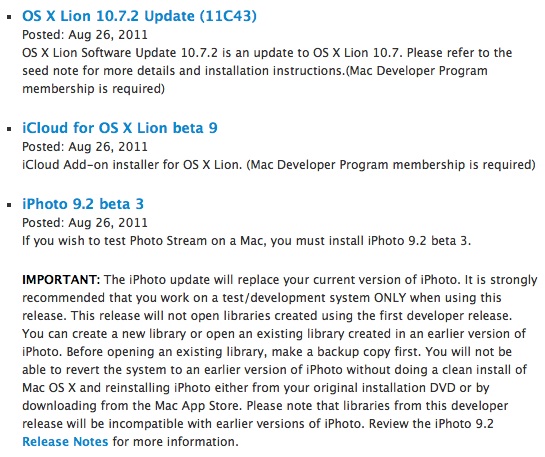 Apple today pushed out several new developer seeds for its OS X platform, continuing to move forward with testing of iCloud. The updates come one week after the previous seeds, which also came alongside the sixth beta version of iOS 5. Among today's new releases for OS X: