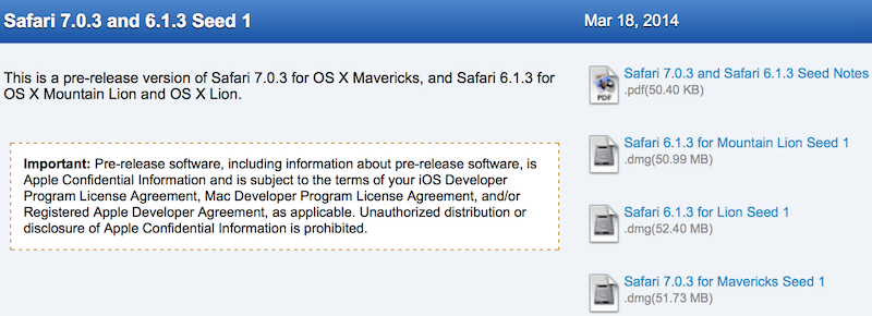 Apple has just pushed the first seed of Safari 7.0.3 for Mavericks and 6.1.3 for Mountain Lion to developers, asking them to focus on Push notifications, AutoFill and more. The betas are available through the Software Update mechanism in the Mac App Store as well as through the Mac Dev Center.