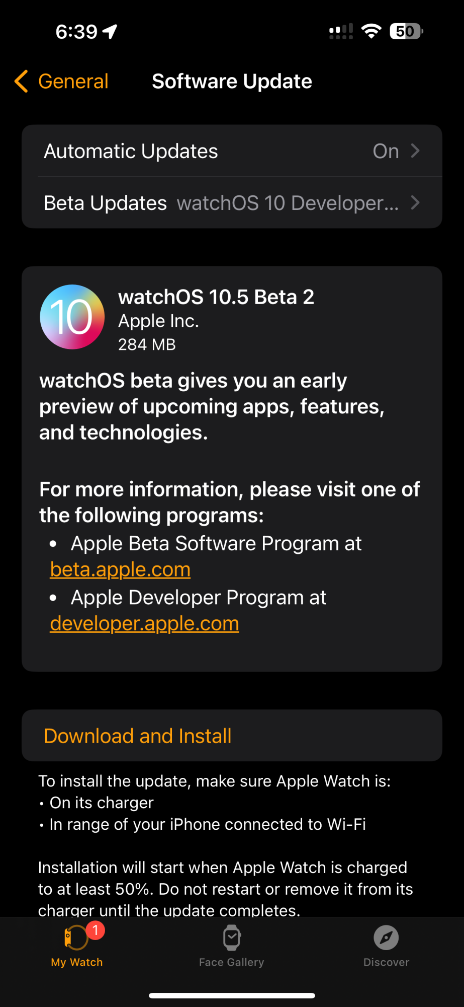 Once beta updates have been activated, watchOS 10.5 can be downloaded under the same Software Update section. To install software, an Apple Watch needs to have 50 percent battery life and it must be placed on an Apple Watch charger.