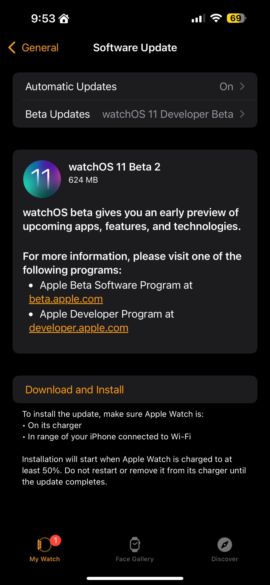 Once beta updates have been activated, watchOS 11 can be downloaded under the same Software Update section. To install software, an Apple Watch needs to have 50 percent battery life and it must be placed on an Apple Watch charger.