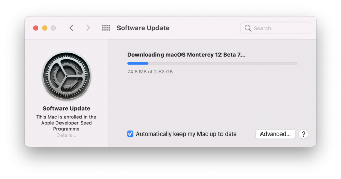 Title: macOS Monterey 12 Beta 7, Version: 12.0, Size: 2306336K, Recommended: YES, Action: restart,