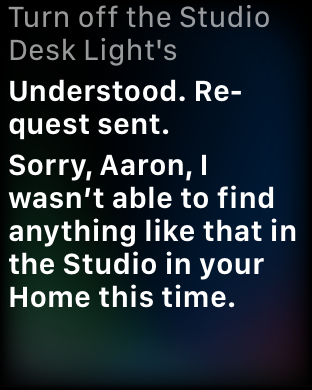 Did you spot the difference? She added, on her own, an apostrophe. Then she didn't understand the query with an apostrophe, and wasn't smart enough to realize that I have something named that without the apostrophe. If I remember right this happened multiple times and I eventually renamed it "Studio Desk Light" even though multiple lights are connected to the switch.
