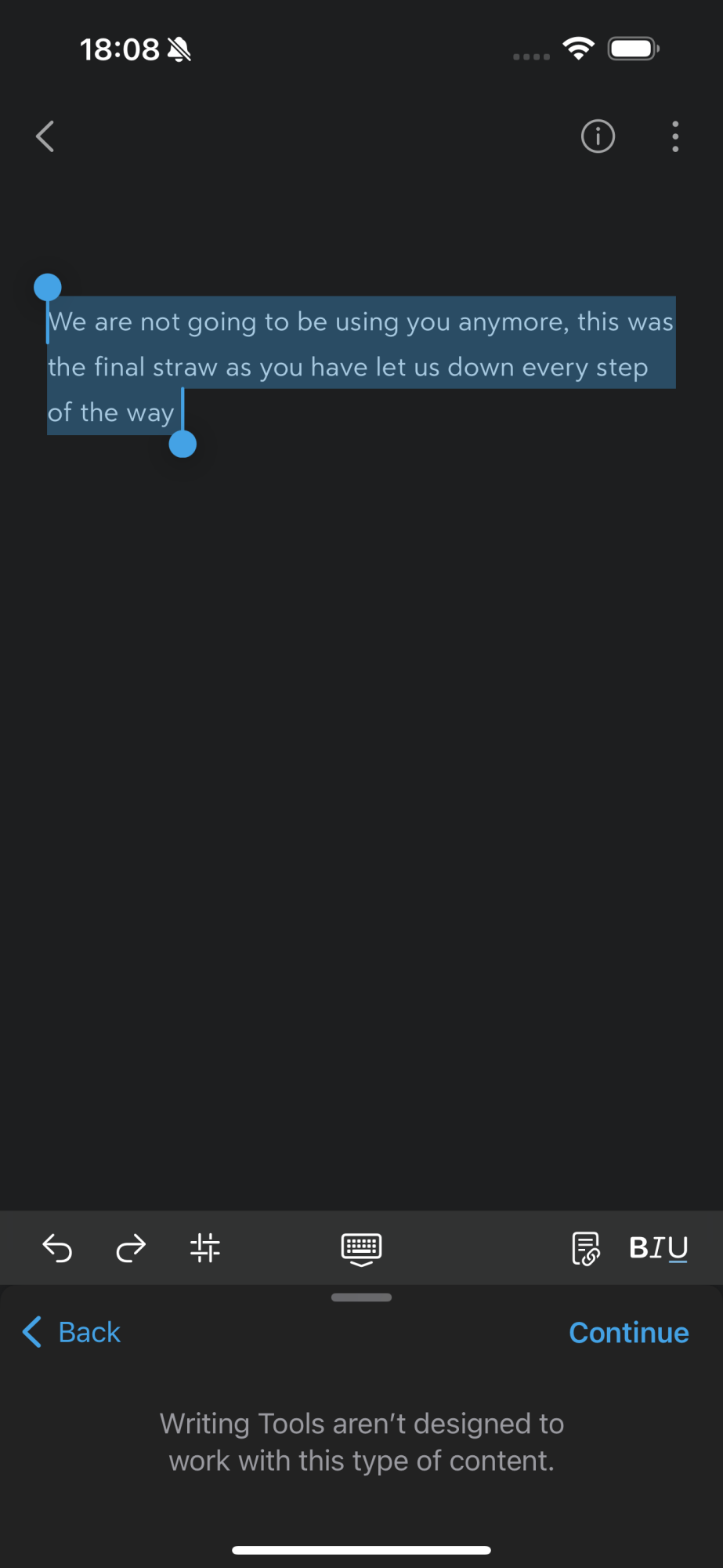 Wanted to rewrite the following to not sound too harsh, and Apple Intelligence doesn’t want anything to do with it. Is this just a beta issue or simply apples general censoring?