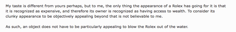 What I said was that *to me* the only thing the *appearance* has going for it is the recognition of wealth. That does not deny its value as a collector's piece or as an investment, which I had already conceded earlier.