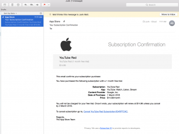 Well that, and the sentence directly before the photo says Apple will always include a current billing address, when the photo of the fake does not.It’s the text in the footer, “If you did not authorize this purchase, please visit Apple Store Cancelation Form” which I assume is a link to a phishing site asking for personal information. Apple doesn’t have a website for canceling subscriptions, you have to use iTunes or an iOS device. Also, “cancellation” is spelled wrong.