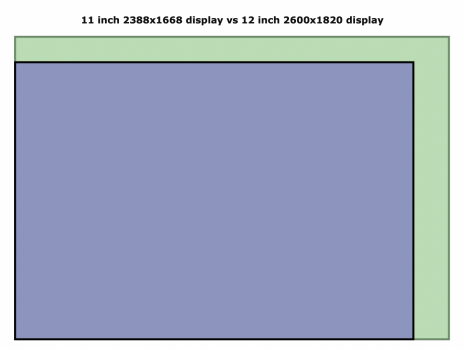 This maintains the current 11" aspect ratio, which is slightly wider in landscape than the 12.9" 4:3. This brings the landscape width only 132px/0.5" shy of the 12.9", more than enough width to eliminate Compact view in split-screen and to make the outer keyboard keys almost full-size. However, because of the aspect ratio differences, the overall footprint is actually still closer to the 11" than the 12.9".