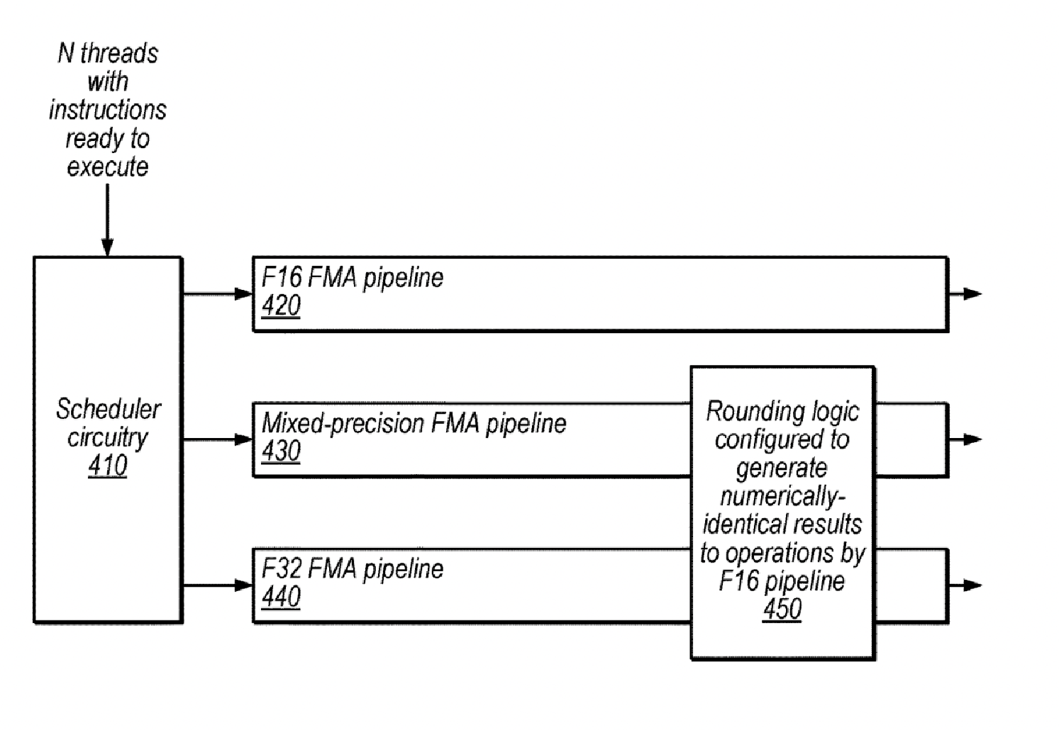 The patent speaks of each SIMD possessing not two but three pipelines, for FP16, FP32, and "mixed precision" meaning FP16 and FP32. Essentially we seem to have pipelines specialized for