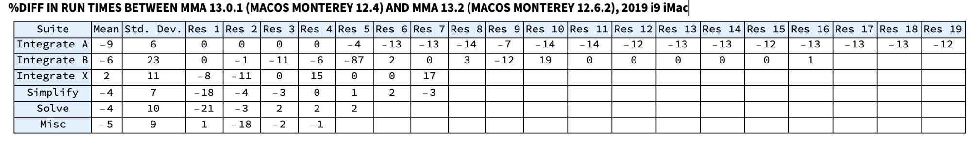 wall clock runtime between whatever they're run on and my 2019 i9 iMac (see config details below). They were run using Mathematica 13.0.1 (current version is 13.1).