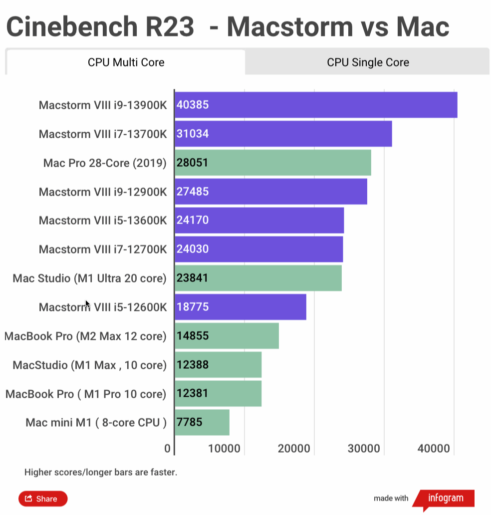 This is the sad part; and it happened with the trashcan also. Nobody should be able to build a hackintosh that outperforms the top end Mac Pro by that large of a margin.This is my new MacPro with Intel i9-13900K![]()