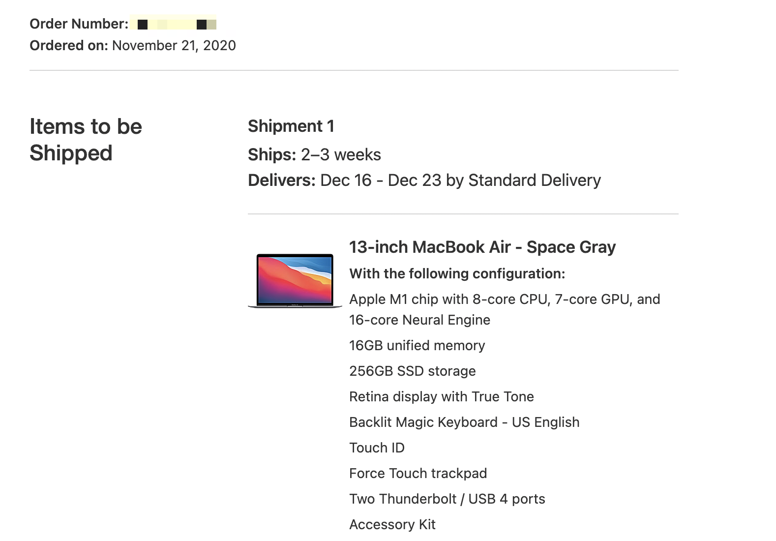 Even better news! The laptop will arrive on 12/10! Man, Apple seriously overdelivering here! Noice!My upgraded M1 MBA finally shipped! 256 GB SSD + 16 GB RAM