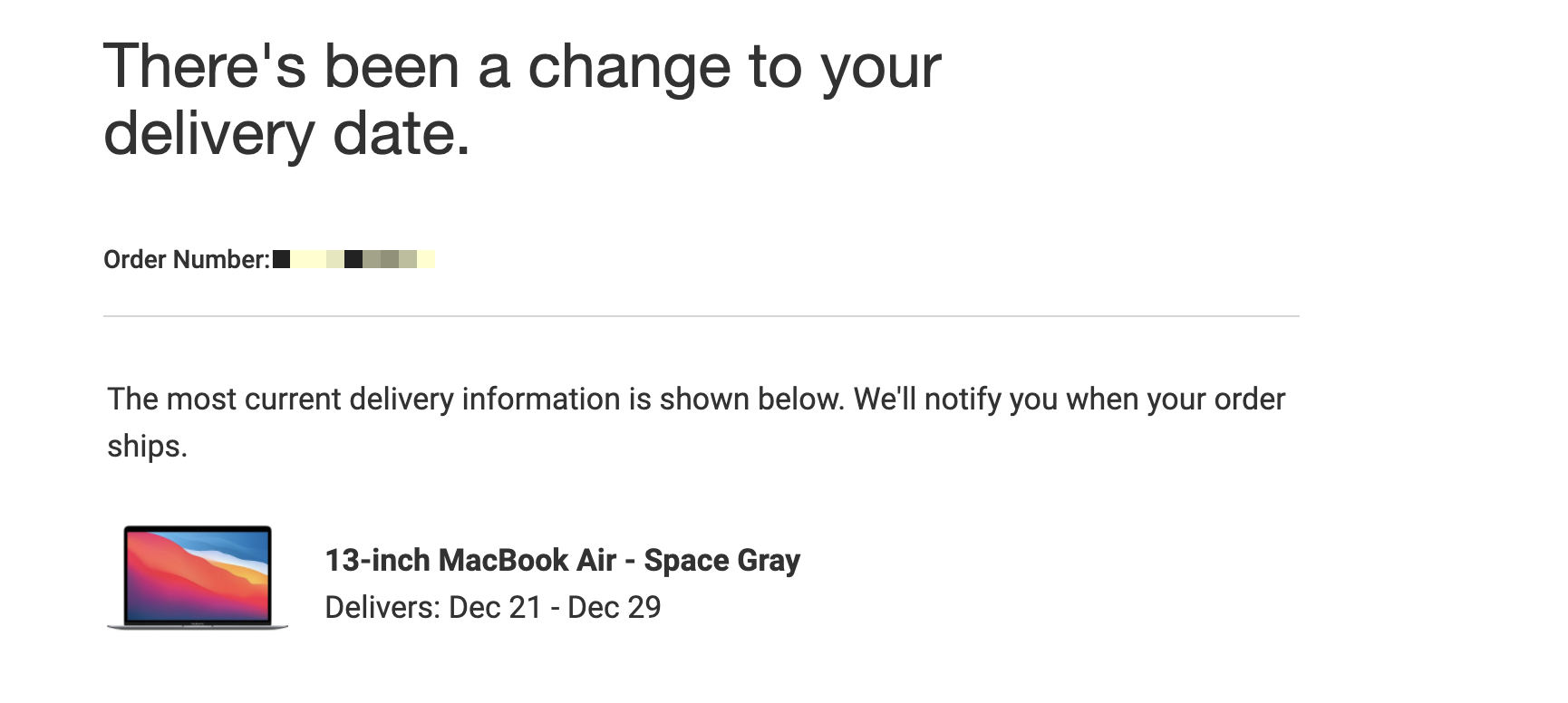 Youll get an email in a couple hours. My delay email was delayed too hahaInteresting news of the day, I have a 16Gig 13" MBP M1 ordered. The delivery date just slipped from the first week in December to Jan 6th-Jan 13th!