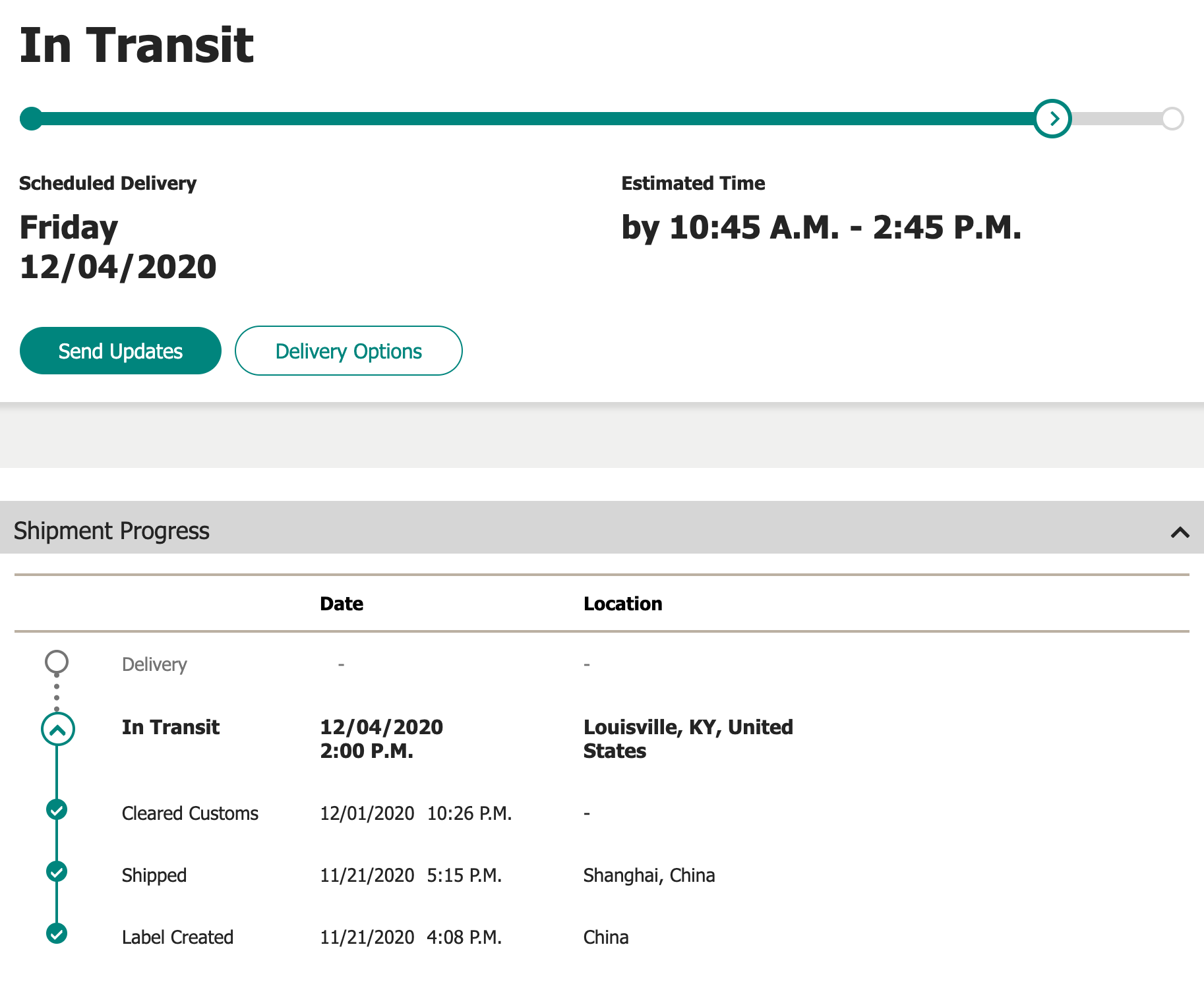 Got a scheduled delivery date of December 10th.Looks like ours are together, mine left at 11:04. Glad these are moving and we’re avoiding UPS which has been trouble for a lot of people in this thread.