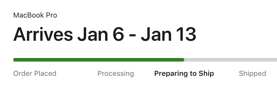 This is really weird, after they have informed me that my delivery will be delayed to Jan 14-20, today, they notified me that my MBP have been shipped. The tracking info shows, I will be receiving my new laptop, and get this, on Dec. 9th. Two days shipping! WOW! I'm not complaining at all with that kind of awesome news.I ordered my MBP on November 10, the day they have launched the laptop. I was promised delivery between Dec. 4-7, but now they have revised to Jan. 14-20, 2021. This is just not acceptable for me. It is very frustrating. This is the same promise delivery date if I've ordered the same MBP today. It seems that I got pushed to the back of the line. This is just isn't fair.