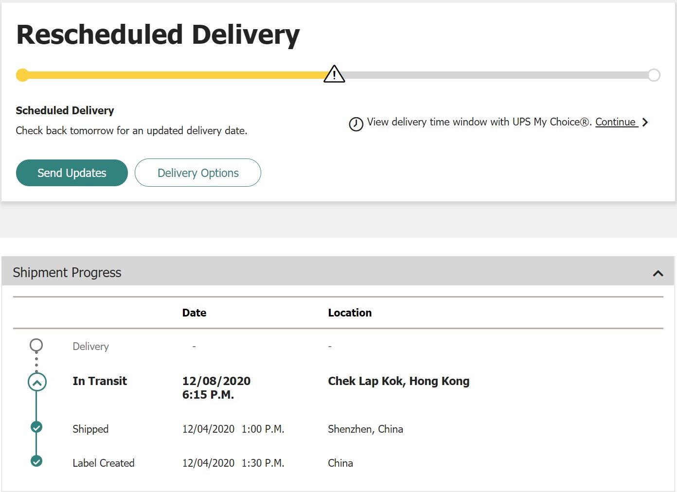 According to UPS tracking it'll arrive 12/10, but as of right now it has not moved since 12/4: