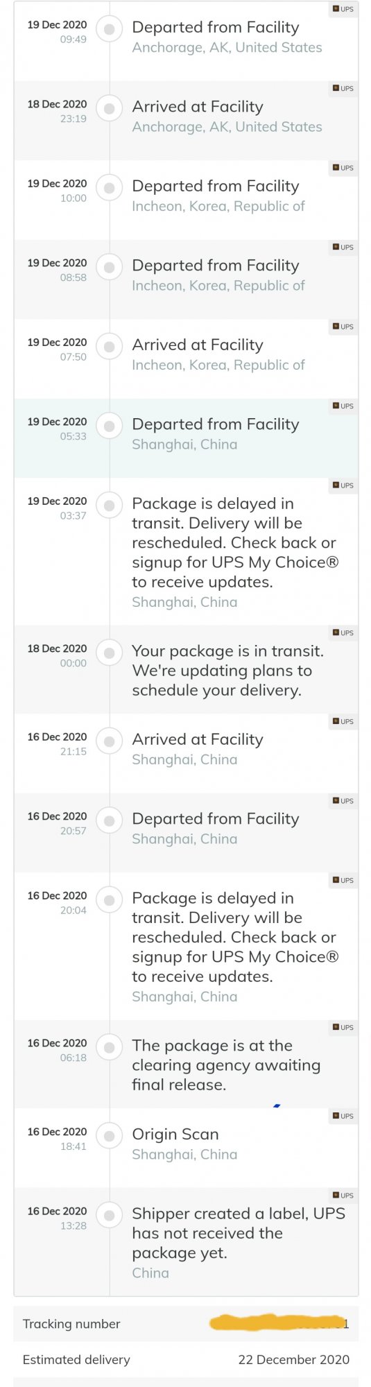 I'm close to Vancouver! My UPS hasn't updated since Shanghai though; what has your route looked like so far?So In looking at the Schedules for FDX 142 to Vancouver, it doesn't fly on Sunday and Monday. This means that if this package misses 2 more flights, it won't arrive until after 29th, which isn't a big deal. There just aren't very many flights between the hub and Vancouver, and I'm sure this time of year, they must be packed.