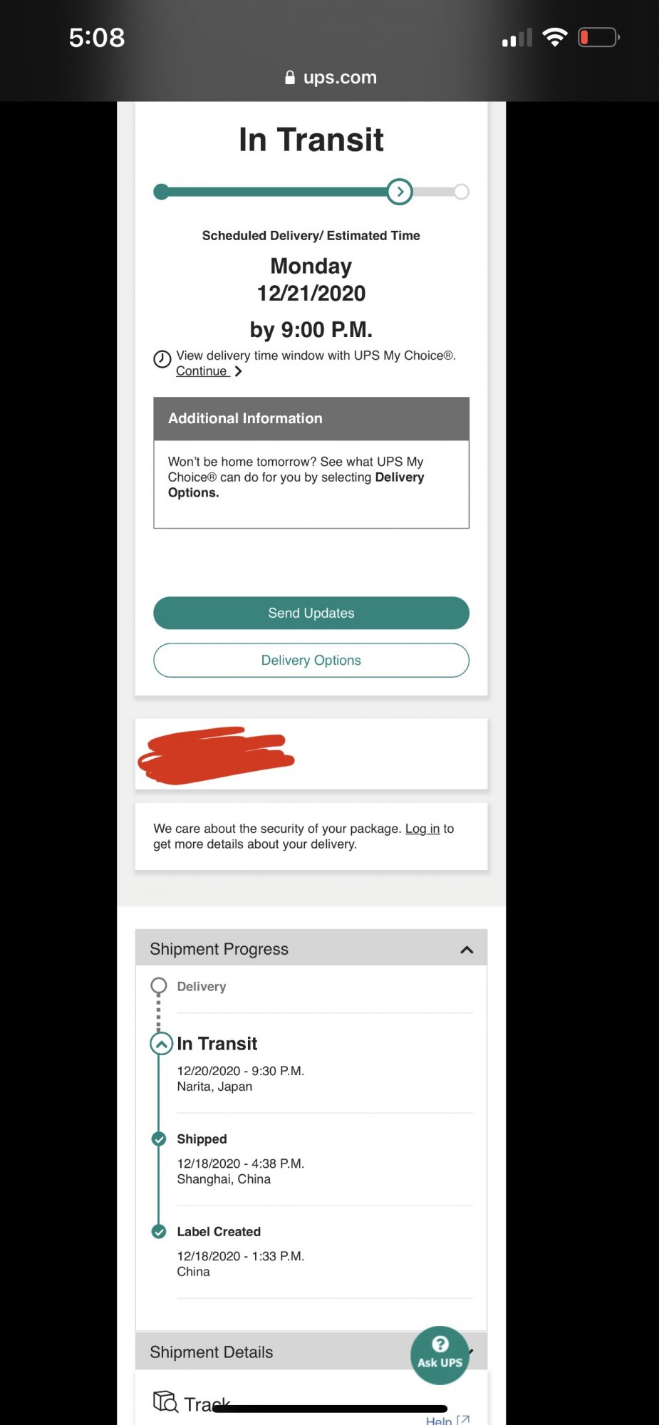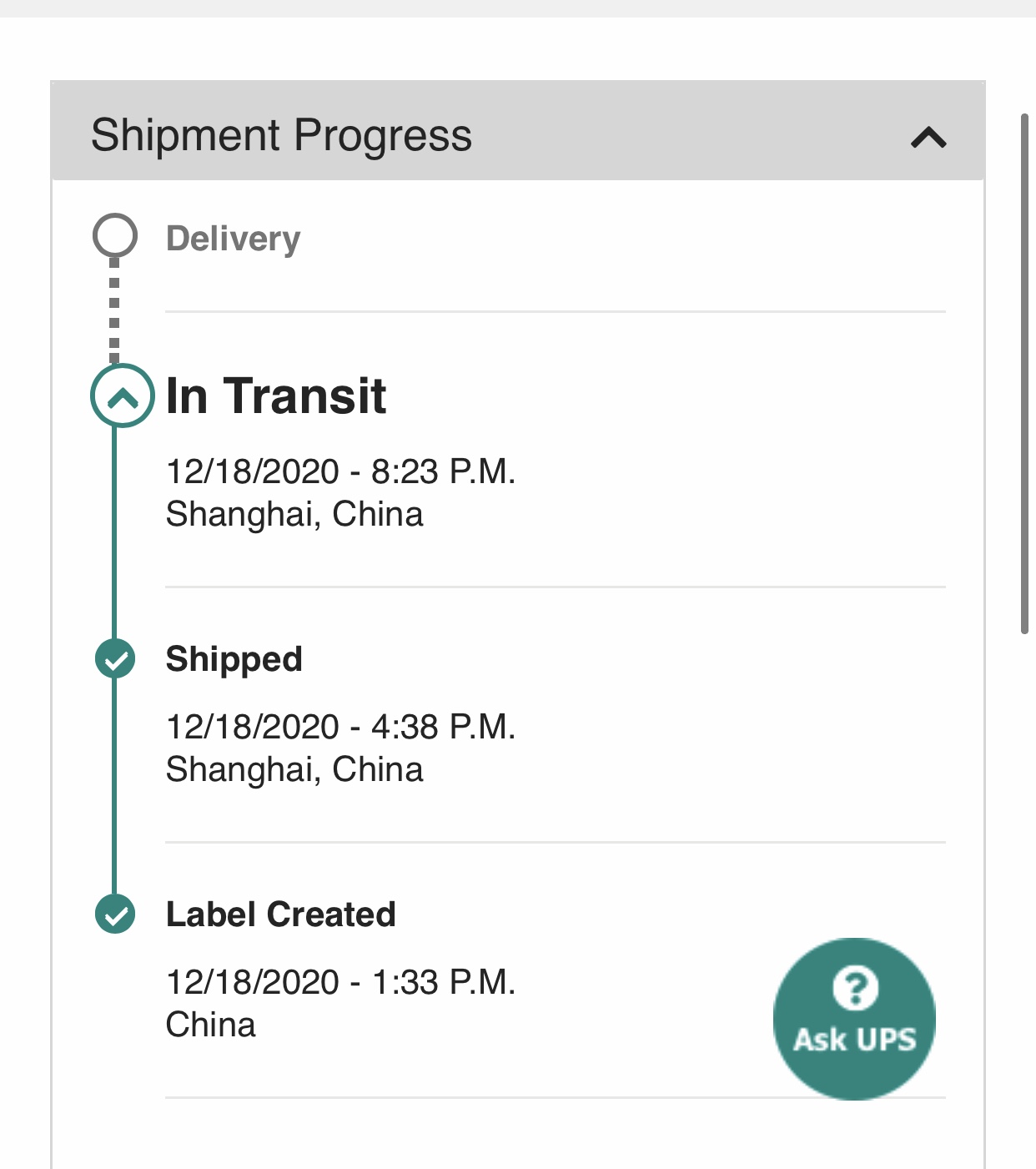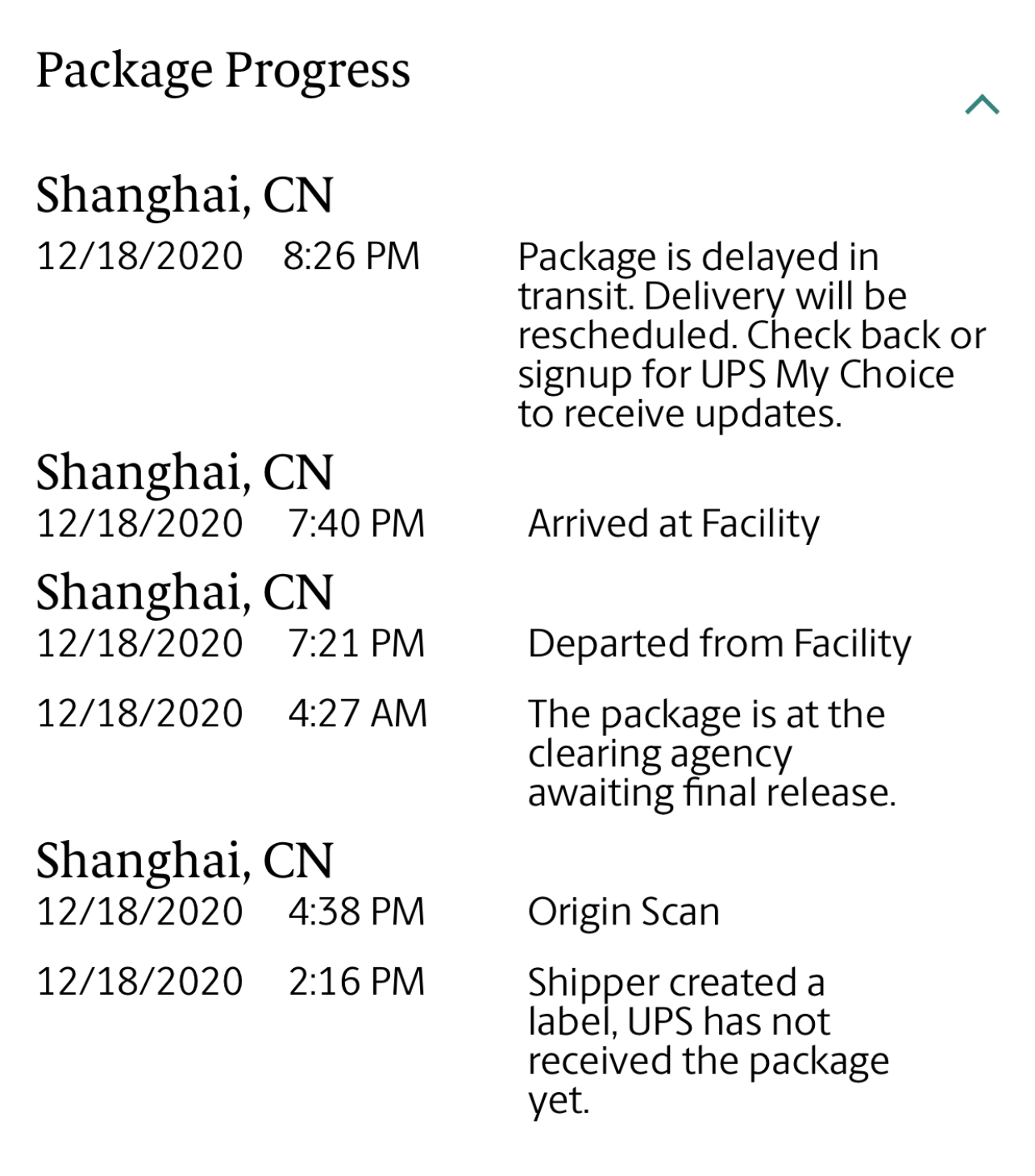 UPS still no estimate, still stuck in Shanghai.