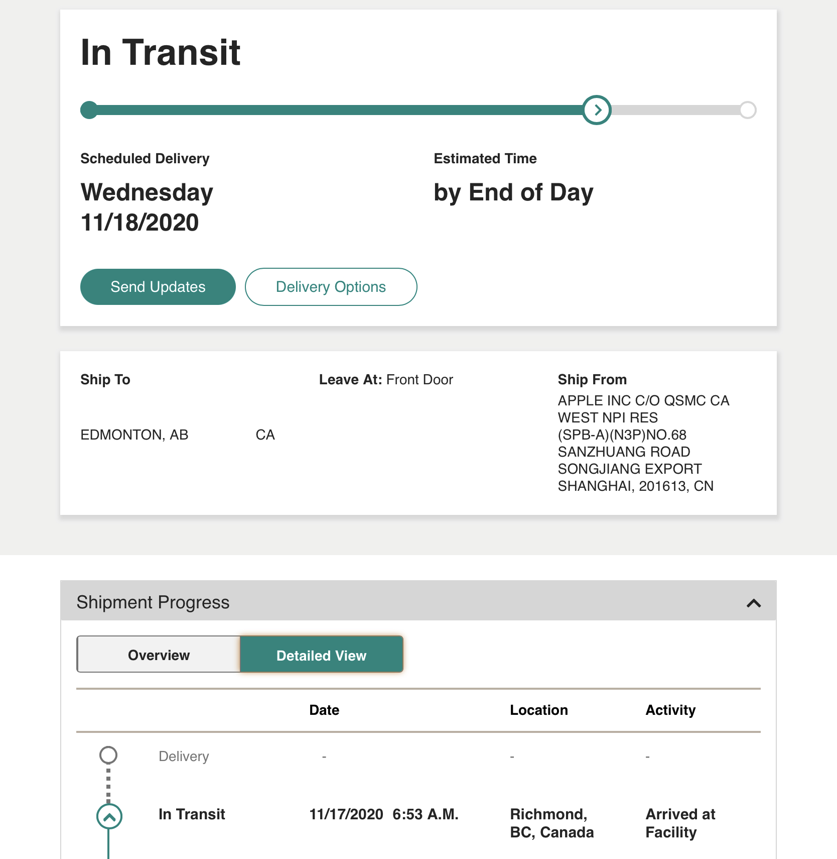 Mine says Departed from Mount Hope this morning at 8.45. Scheduled delivery today. Hope it's real.Base MBP shipping progress - Toronto bound. LOL I could've just gotten it today at Apple store. Although it looks like Apple Store doesn't have availability for BTO yet, they only have 8gb MBPs and MBAs.