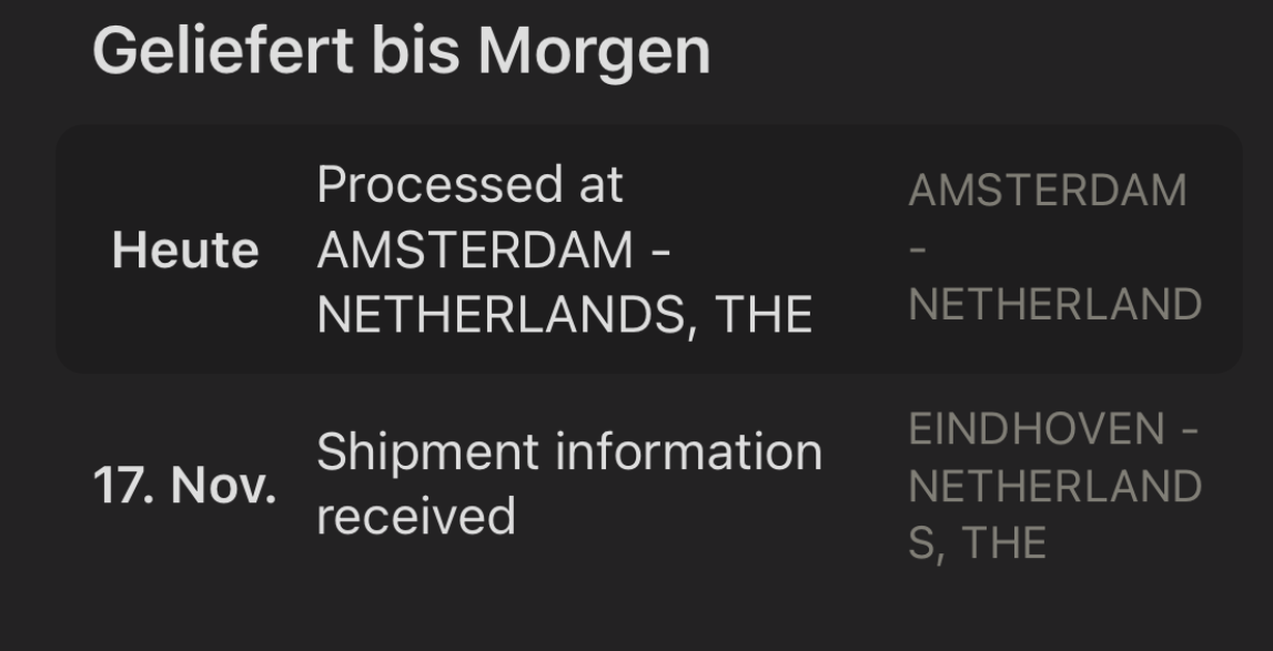 Just liking for Eindenhoven. Reads in Australia like a mine and craft hub from LOTR!Finally it did move from the Eindenhoven, and it will hopefully be delivered tomorrow.
