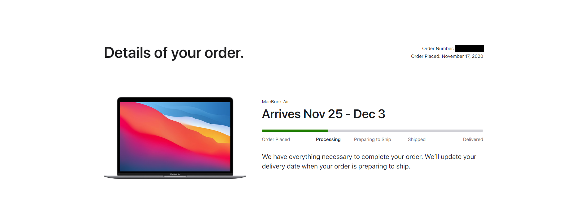 Wow I ordered on the 14th still nothing. That's a constrained configuration compared to other ones for the mbp. Does the website show preparing to ship? Or is the charge the only hint of movement?I ordered on 11/15, the MBP 16GB/512.