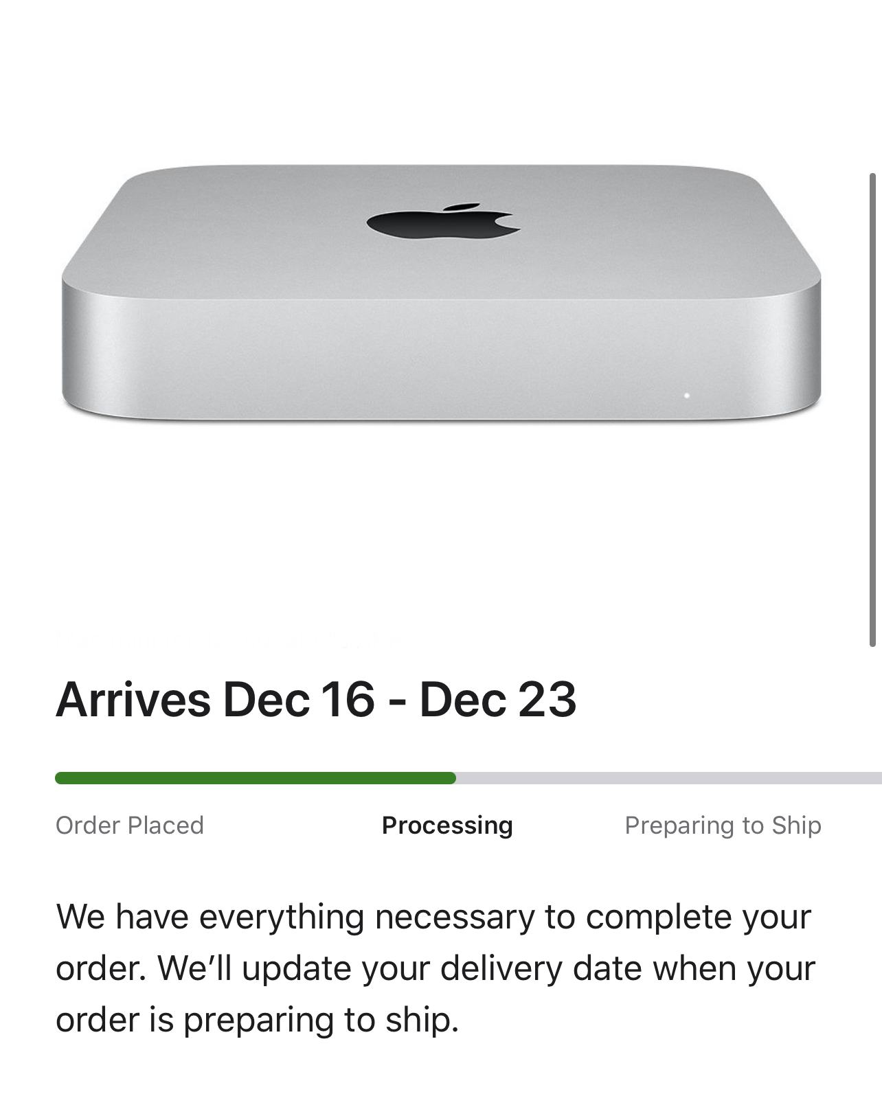 My 16/512 mini also moved to Dec 16-23. Was originally Dec 22-30. (Ordered 11/20).Got an update from Apple for Mac Mini 16GB....moved up a day from Dec 17-24 to Dec 16-23. Hey it’s something. 🤷🏾♂️