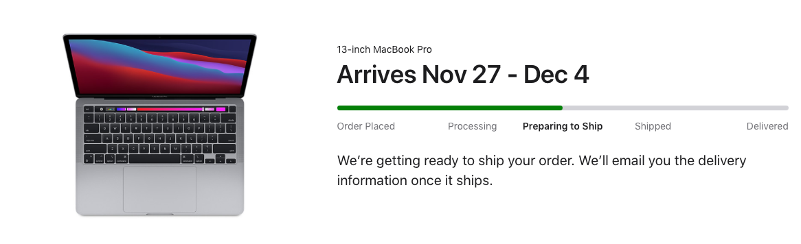 Thx, and I empathize with you that it's taking so long.Ordered before noon CST on November 11- M1 MBP 16GB/2TB. Still shows Preparing to Ship...