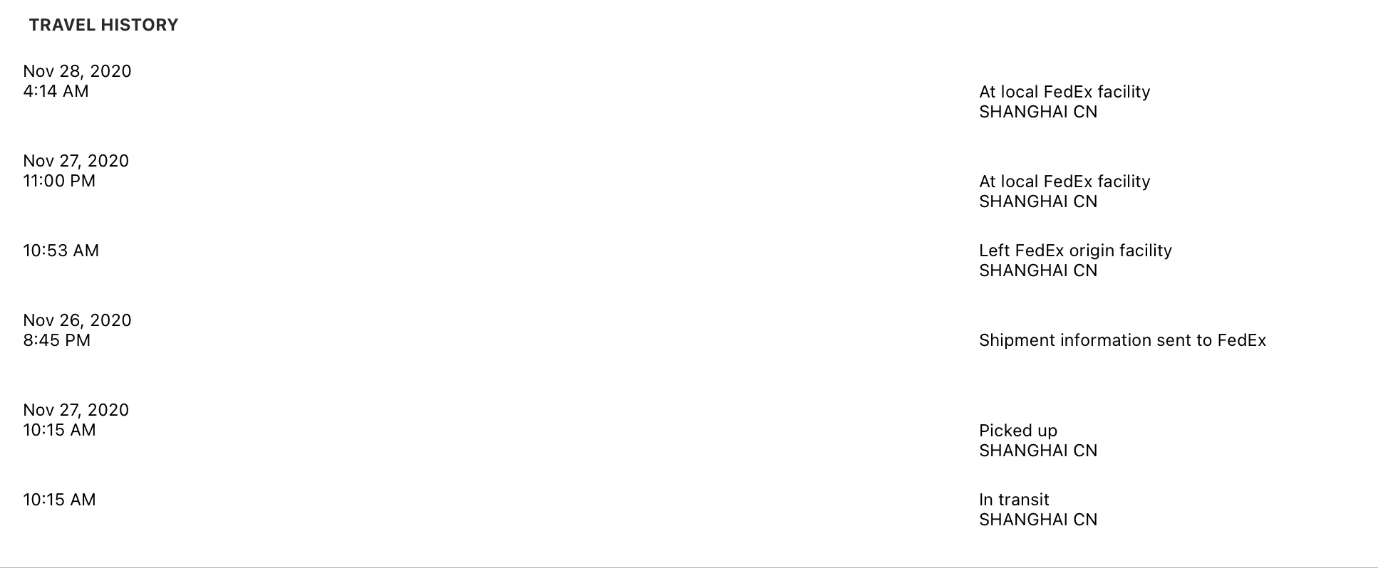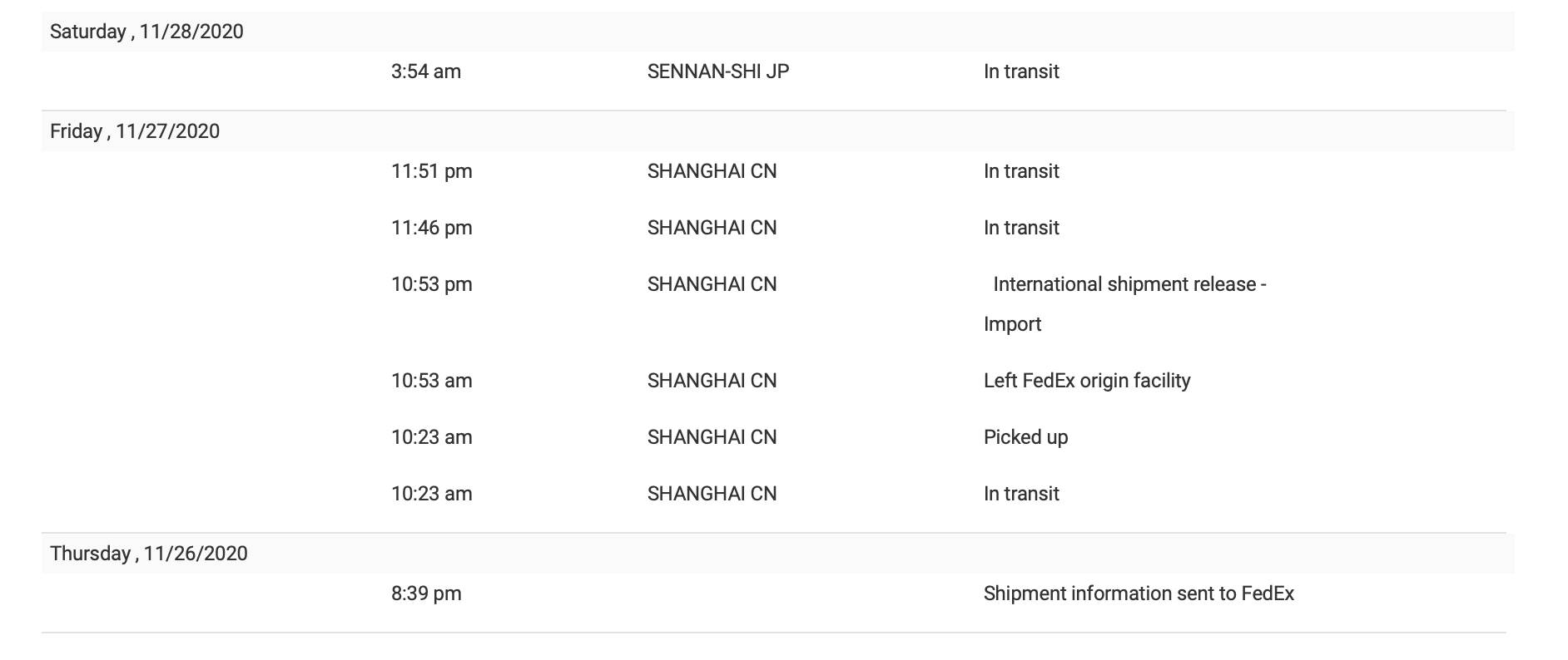 Shanghai Gang: I spoke to Apple Support about my order. They're saying that the "In Transit" status means it has left Shanghai and is on a boat and hasn't made landfall yet in the US. They're saying the order can't be air shipped because of the battery type, and that I should still receive it by Dec 1. I don't believe that at all, because everyone else is getting their orders air shipped and it would take much longer if it was coming from China on a cargo ship - weeks.