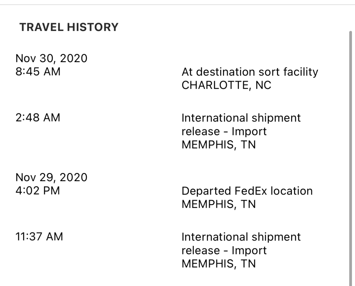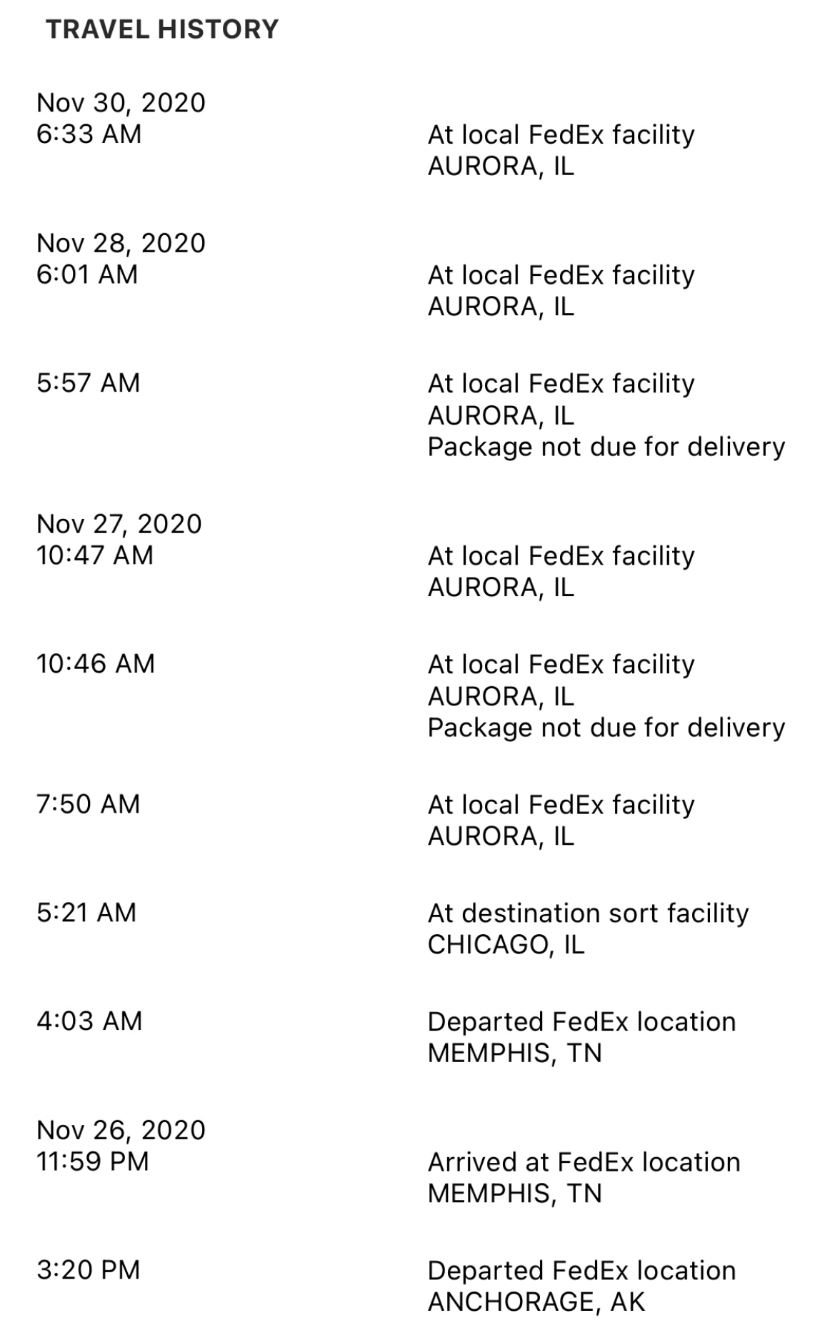In roughly 25 hours my M1 MBP 16GB/2TB went from Shanghai to Anchorage, to Memphis, to Chicago, and finally to my local facility. 25+ hours! Then after checking in at 7:50AM on a Friday morning, it remained on a shelf for (so far) over 73 hours! Ok fine, “no weekend delivery”.. and yes, it did arrive on Black (metal) Friday.. but come on! I’ve had all weekend off and still have today off.