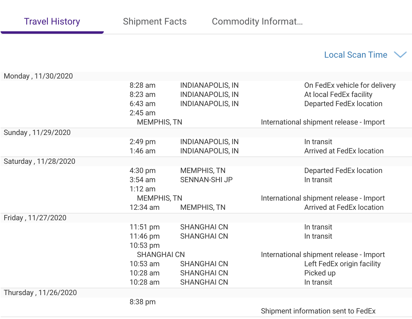 I’ve always had excellent luck with FedEx, too. Almost always early or at the very least on time. As for the times listed, it’s not listed on Mobile or on the App, but you can adjust the times to show only the destination times, that way you don’t have the weird time differences. It’ll still show local Shanghai time when it left, but then destination time after. Factoring all of that in for me it’s roughly 25½ hours from Shanghai to Aurora, IL.If this is ups thats why you dont have a delivery. It'll sit there until the scheduled delivery date. Also just so you know UPS took more than 24 hours you forgot that we live in the past and the time change messing up with how fast shipping takes. According to fedex my both of my laptops shipped on day apart arrived in TN within 24h from china which has multi scans along the way at odd times contradicting each other because of the time differentials.