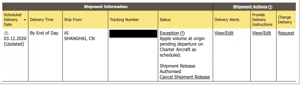 In UPS My Choice, the tracking status just updated to this. Looks like a custom tracking status just for Apple deliveries(?) — but not sure what this means. It's an exception but still on schedule?