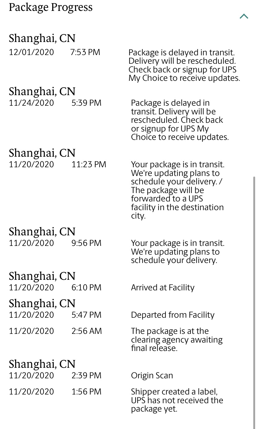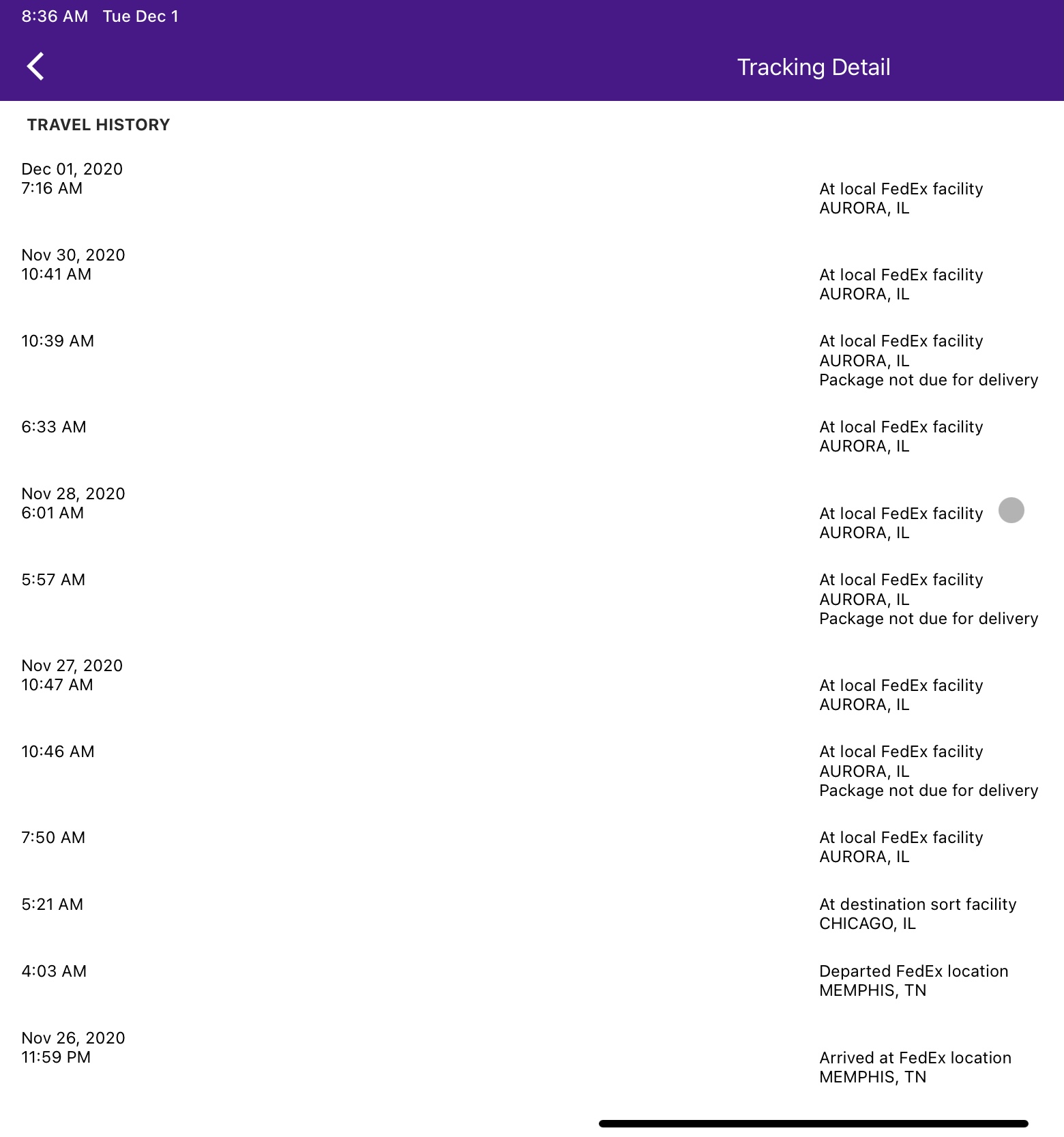 Ordered a 2020 M1 MBP 16GB/2TB on Nov 11, it finally arrived at my local FedEx facility (about 30 min drive) on Nov 27 at 7:50AM. The entire time it’s been listed as Scheduled Delivery on Dec 1 by Noon, and I’m still not seeing any update other than it’s still at my local facility. So maddening.