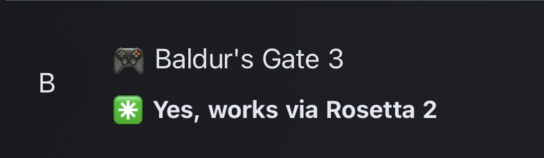 Not true at all. It has supported arm64 native since 1 year ago.Baldurs gate 3 is not Apple Silicon game, it uses Rosetta 2 x86 emulation.
