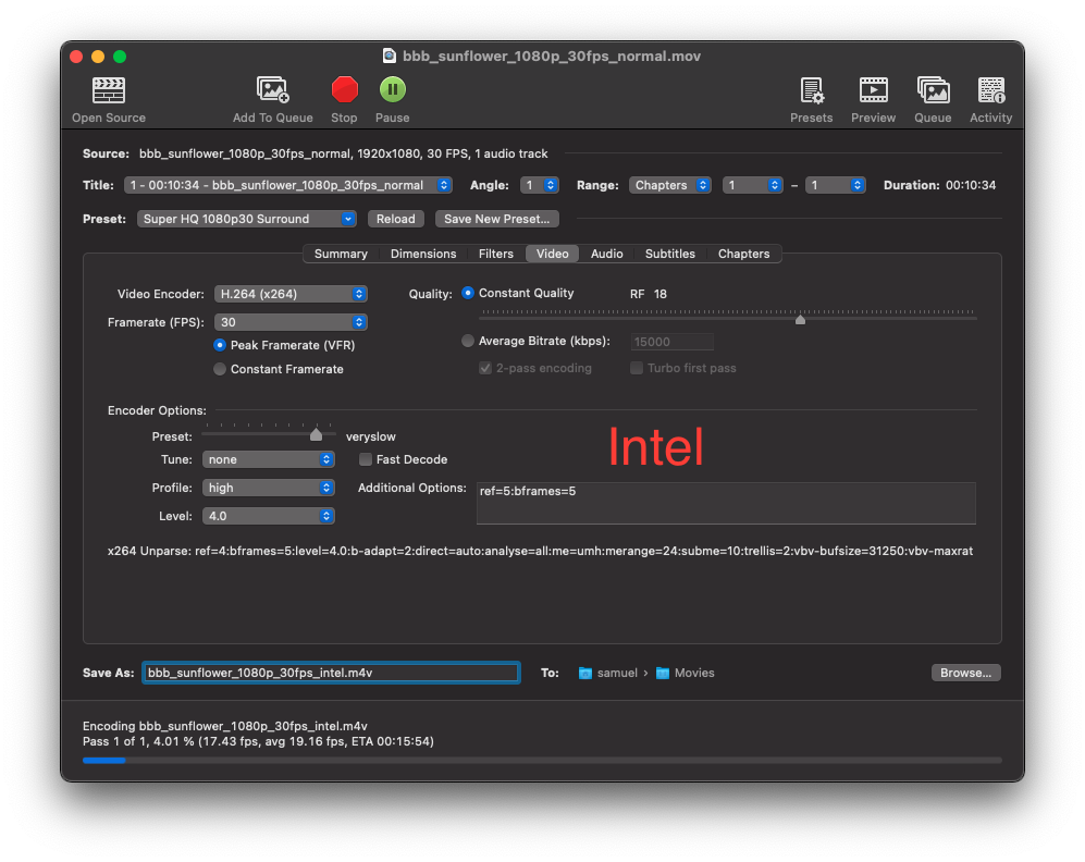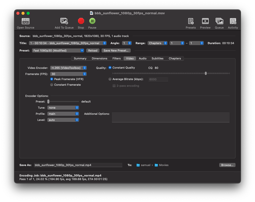 Thanks for the screenshot (but no thanks for making me think even more of selling my 16" and getting a M1 Air 😇).1080p 30 Big Buck Bunny. H265 hardware encoder. QF 80. Average of 169fps.