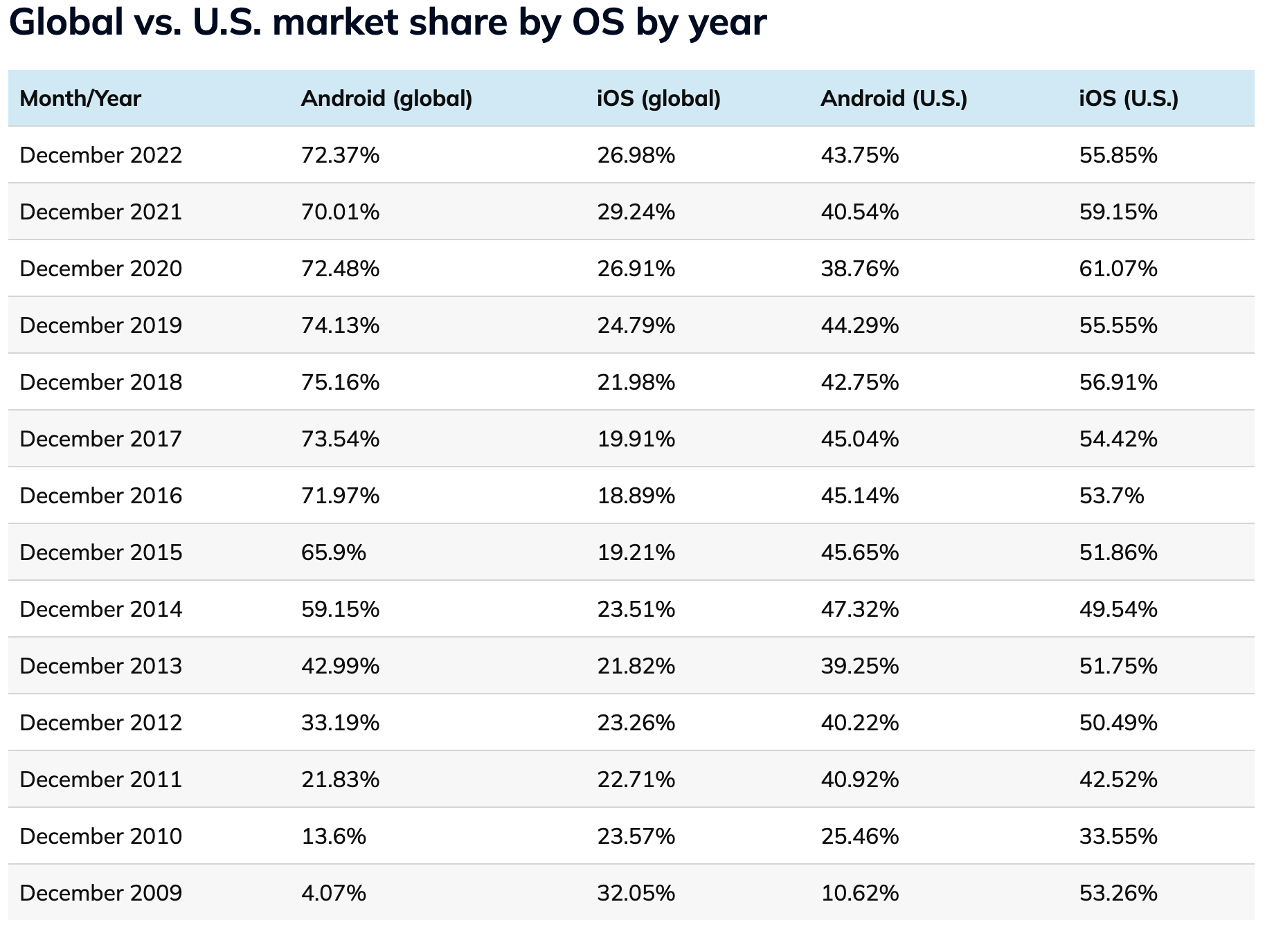 The key difference is many of those OEM's are BANNED in the US due to security concerns which gutted the market and options here as well as companies like HTC and LG pulling out of the phone market leaving essentially Samsung and a few niche brands like TCL trying to grow their product portfolio. IOS in the US has had higher market share than Android - but Android is climbing closer and closer year after year for these reasons and globally is higher over all.