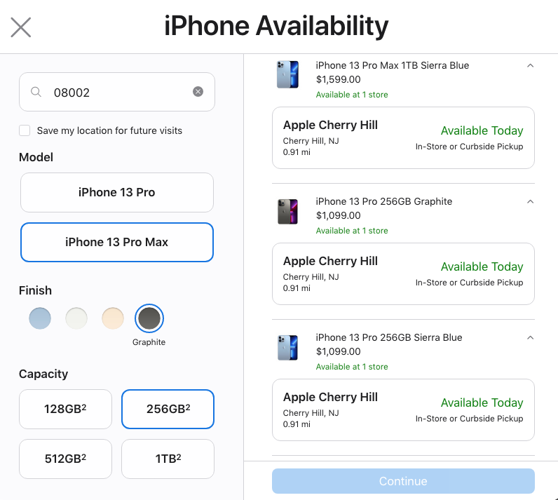 You have to continuously be checking throughout the day, refresh the page as often as you can with your zip code always plugged in. I was able to lock in my iPhones Pro Max 512GB this morning, and picked them up this afternoon. Apple guy at the store told me inventory is getting very limited on Pro and Max models of any storage capacity, and might get worse before it gets better. Good luck to everyone.