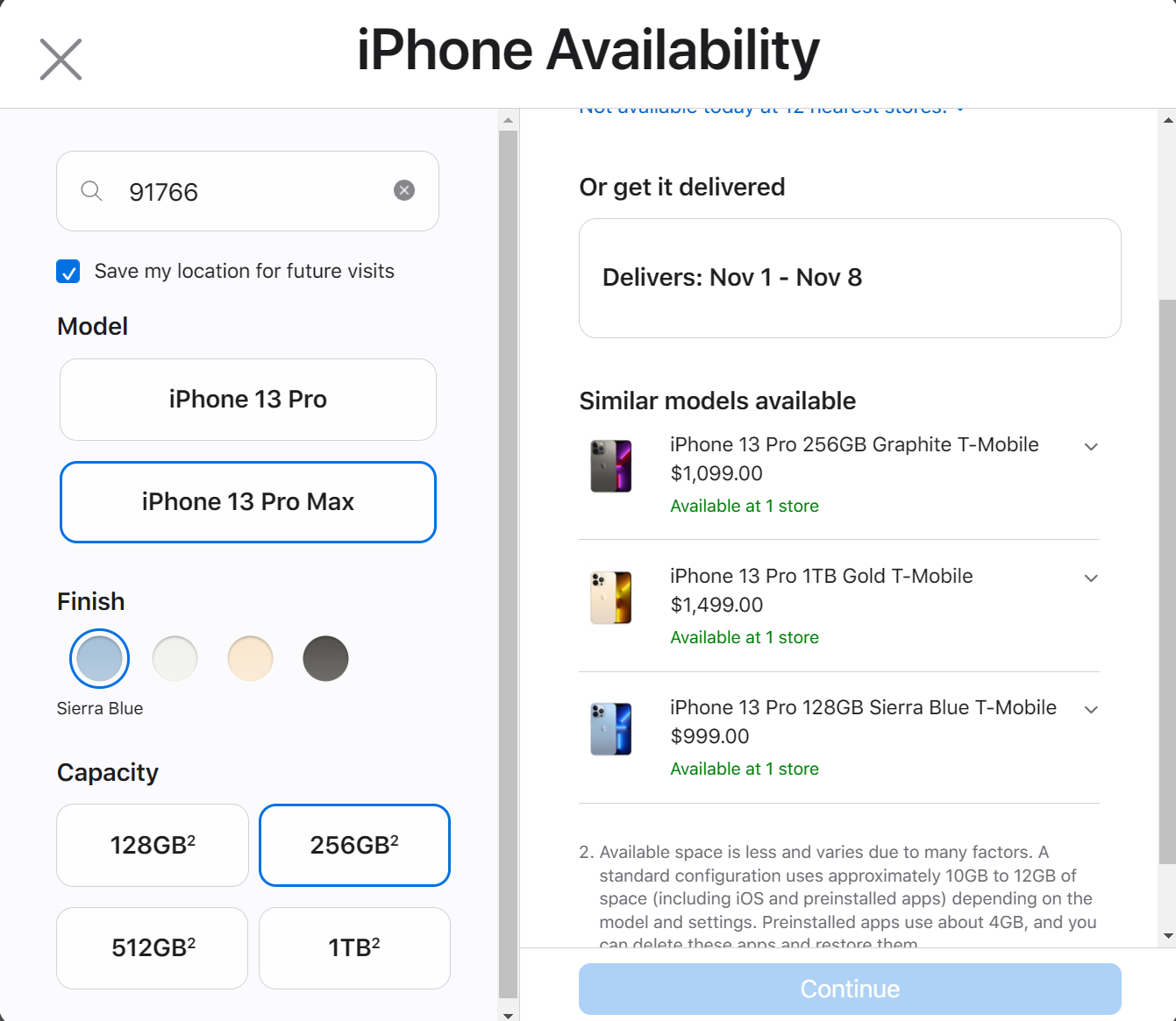 My wife wasn't even planning on upgrading, as she was still happy with her 11 Pro, but her birthday is coming up next week and I insisted on making the 13 Pro her birthday present. We went to the store on the 25th and I reserved it for pickup on the following day, which was a smart move on my part. When we arrived for our appointment, they were already sold out of most variants, including the 256 GB Sierra Blue 13 Pro.Yup! Crazy...if anyone didn't get the color they like this year, they'll probably have to hold on to it...that 14 day window is looking smaller and smaller, at least in the NYC/NJ area.
