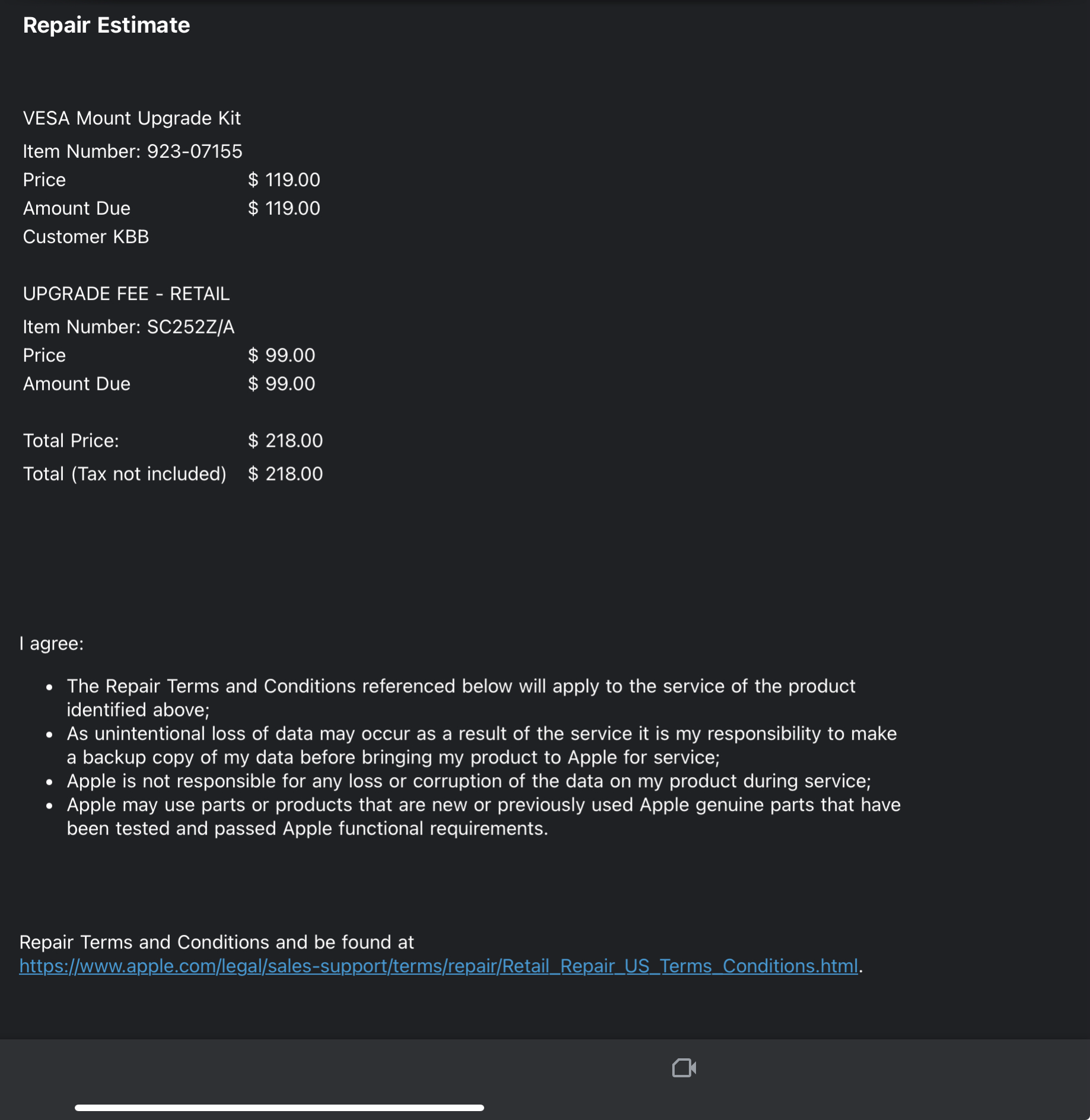 Not sure if anyone is still looking for this info. But apple will swap the stand for vesa mount and vise versa. The cost is $119 for VESA mount and $99 for labor as they claim this repair is “out of warranty” they will also return the stand to you and it’s $99 if you ever want to swap it back.apple care + has no bearing under it they tried to get the labor waived but apples system wouldn’t allow it. Here is the service receipt to go from tilt stand to vesa mount