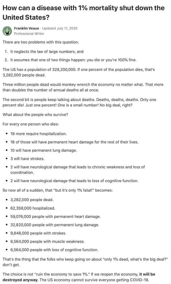 American numbers are way past “a cold.” This is denial, folks. This is the reason six figures are dead. And growing. This is the reason hospital beds are filling with covid patients and people of all ages with other illnesses will be unable to get typical care.