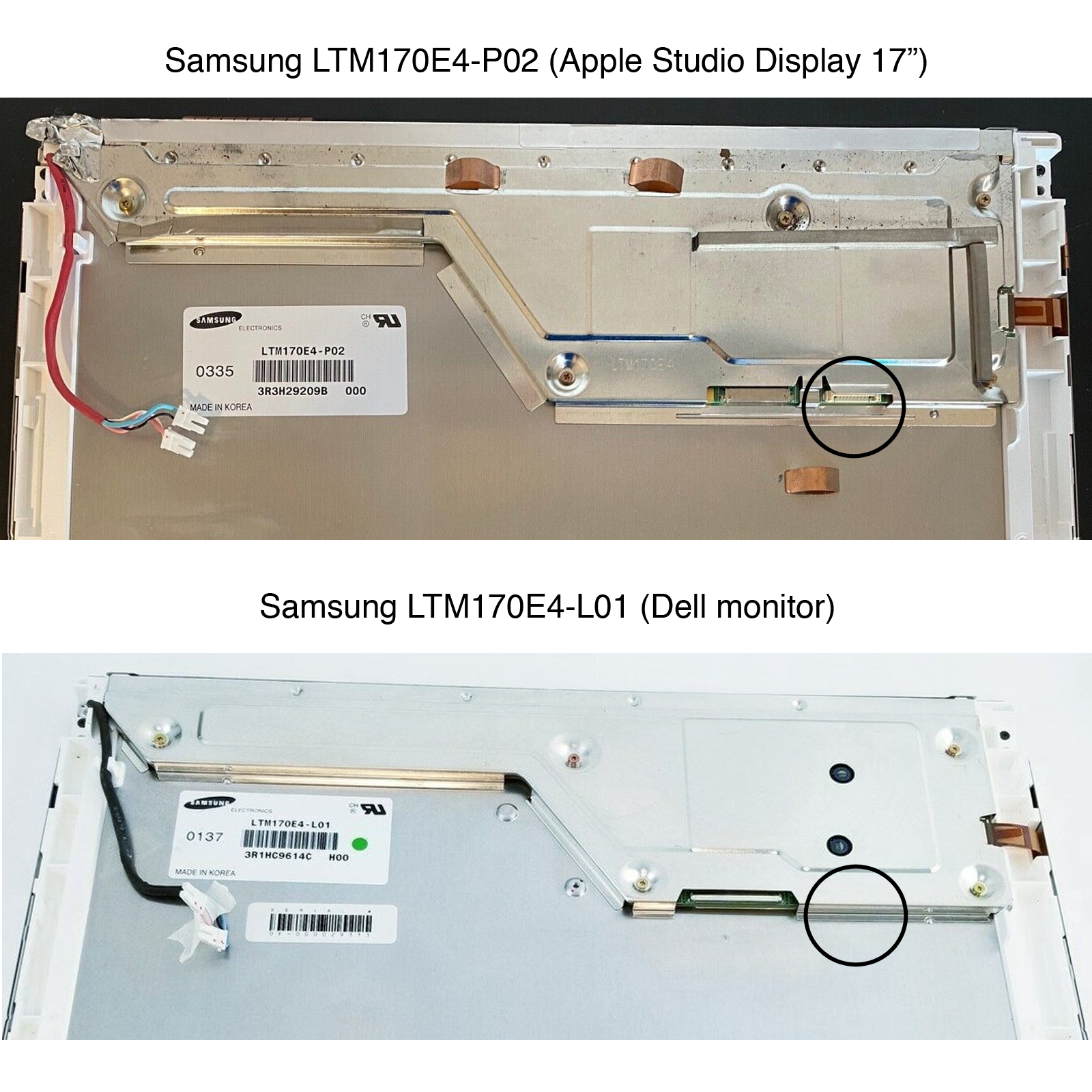 The LCD panel inside of my Studio Display is a Samsung LTM170E4-P02. The LTM170E4-L01 was used in a Dell monitor (UltraSharp 1702FP), I could try finding one of those to get a replacement panel, but it is missing a connector the P02 inside my display has. I am attaching a photo comparing the two LCD panels which has the missing connector outlined.
