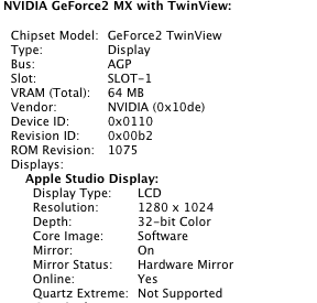 The Power Mac has an NVIDIA GeForce2 MX (TwinView), the card's VGA output works correctly.