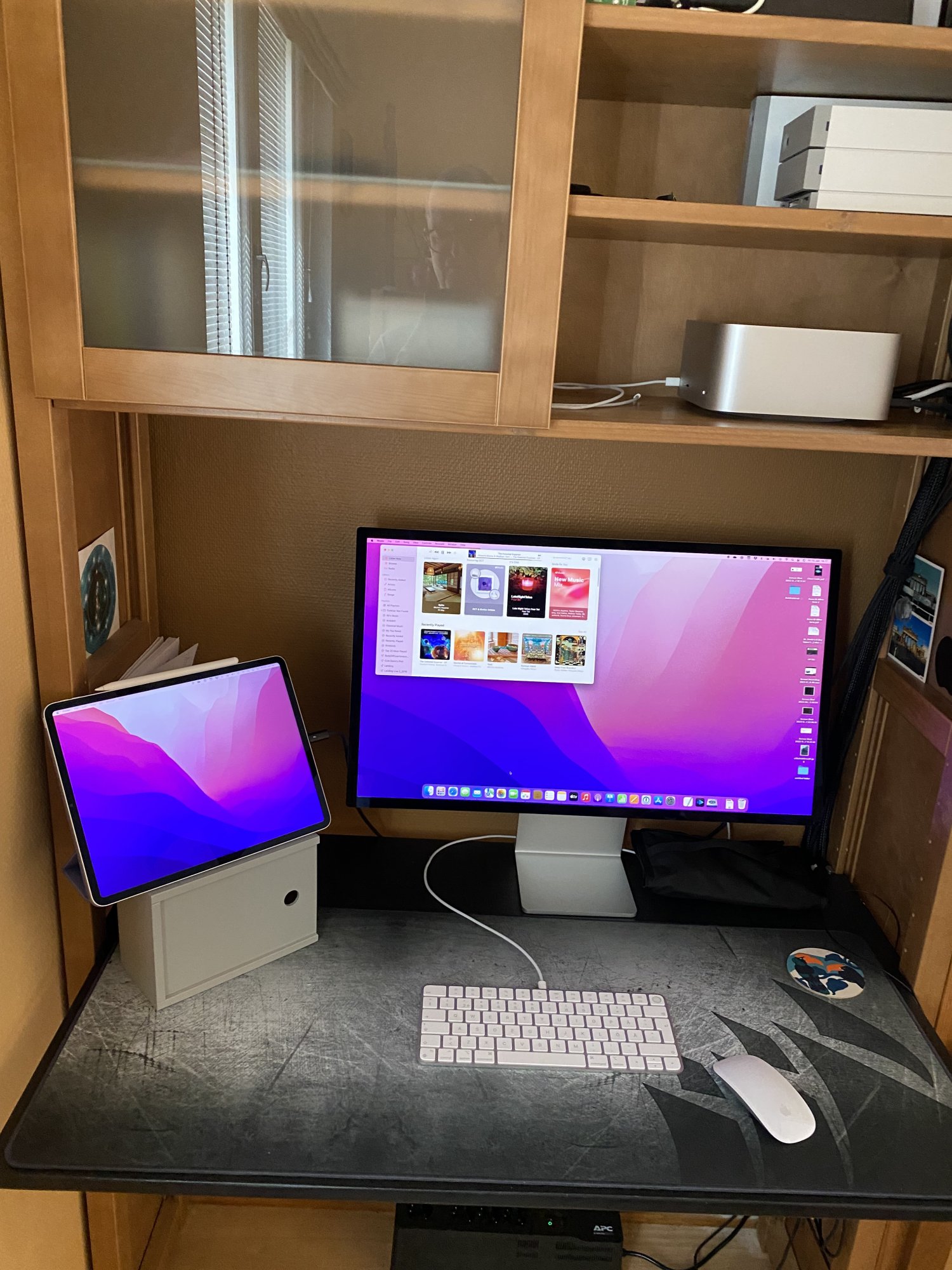 I've just finished doing the cable management and thought I'd share the set up. We don't have a lot of space, so I've gone with a vertical system, ASD and iPad Extended Display on the desk. Mac Studio above in the cabinet which also kills the fan noise, along with a couple of LaCie hard drives, though they are so loud sounding now, that I'm not keeping them plugged in, time to upgrade to SSD external drives. A 43" Samsung TV is just to the right of the picture.
