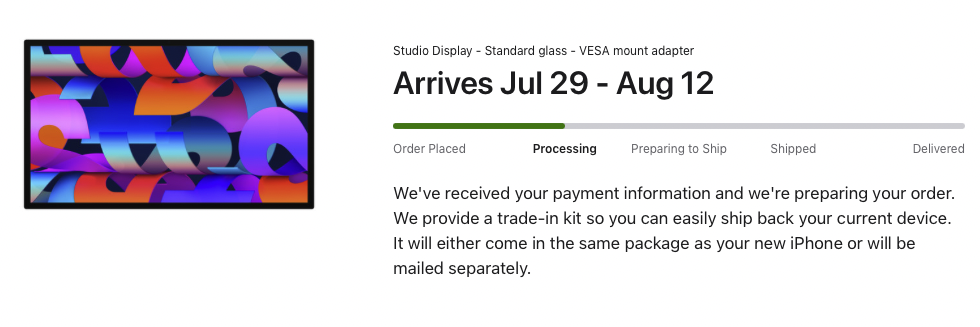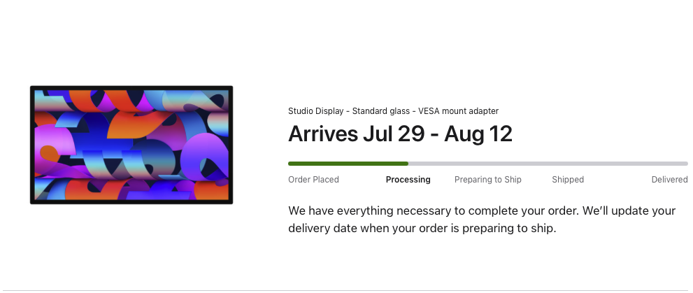 My Studio Display, VESA option, finally arrived in Los Angeles. It's absolutely gorgeous. Very happy with it.