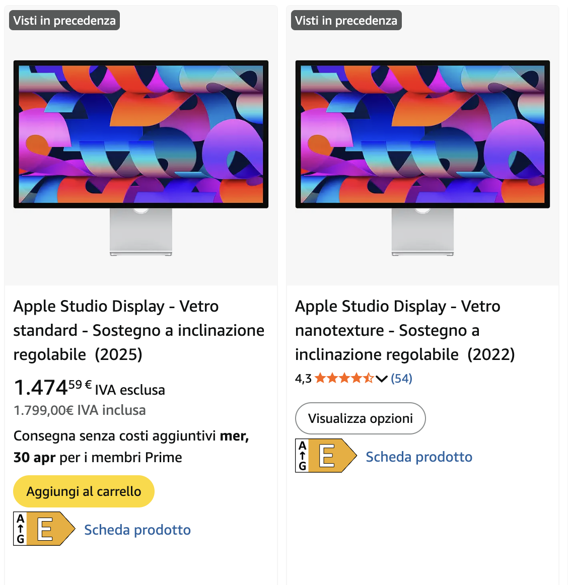 in early March the Apple Studio Display (2022) disappeared from Amazon.it. A couple of weeks later a new product labeled ASD (2025) appeared. The previous model was also slightly discounted, while this one is listed at full price in all its variants.