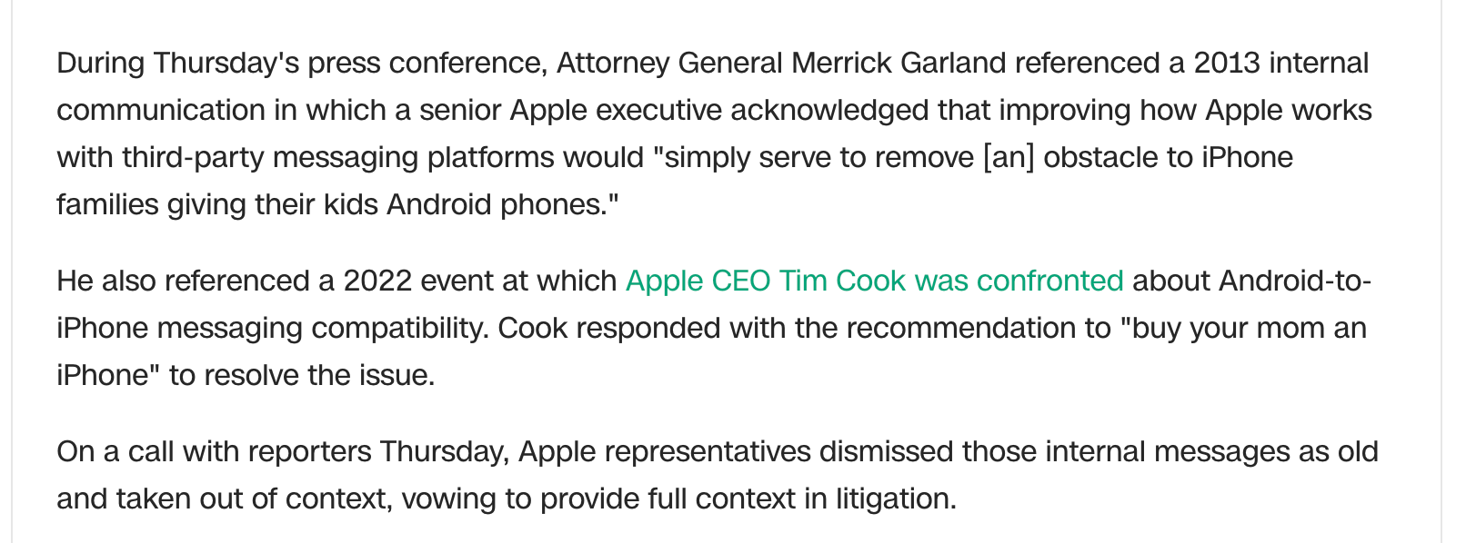 Among other things, the DOJ says Apple has used its control over iOS, the iPhone operating system, to block innovative new apps and cloud streaming services from the public; degrade how Android messages appear on iPhones; restrict how competing smartwatches can work with iPhones; and hinder rival payment solutions.