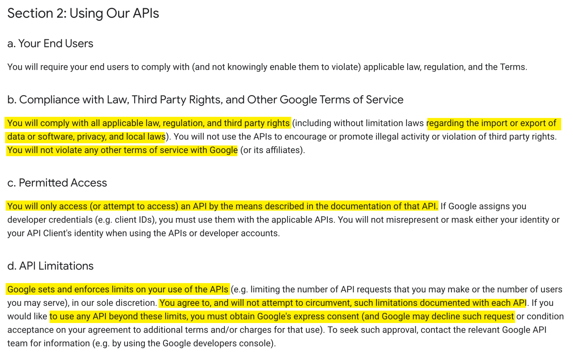 Their doco is just as limiting as to what you can do legally and solely at Google's discretion.