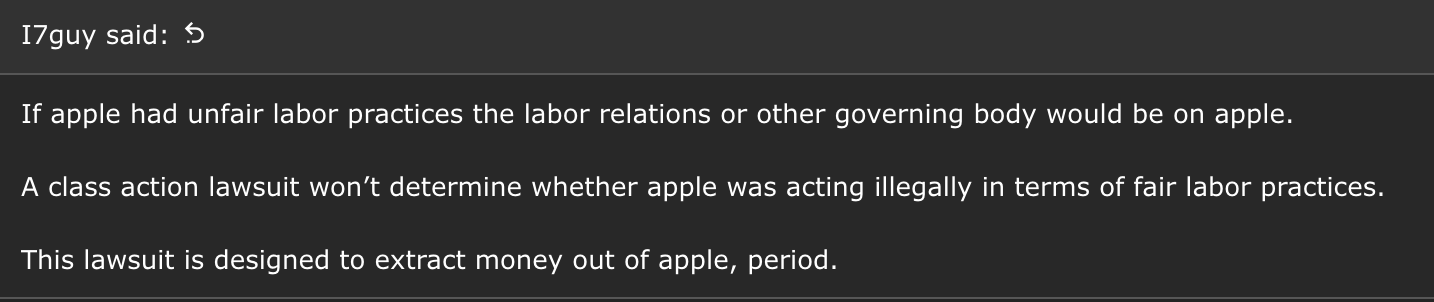You can sue anyone doesn't mean it will go anywhere, from this article...They are. Yikes! Might need to search first. I just gave examples of other companies since everyone thinks Apple is immune. If other companies aren't, than Apple isn't either. Here's a link about US Labor board filing a complaint against Apple for some of the practices in this lawsuit, and they were filed in October. https://www.reuters.com/technology/...-imposing-illegal-workplace-rules-2024-10-01/