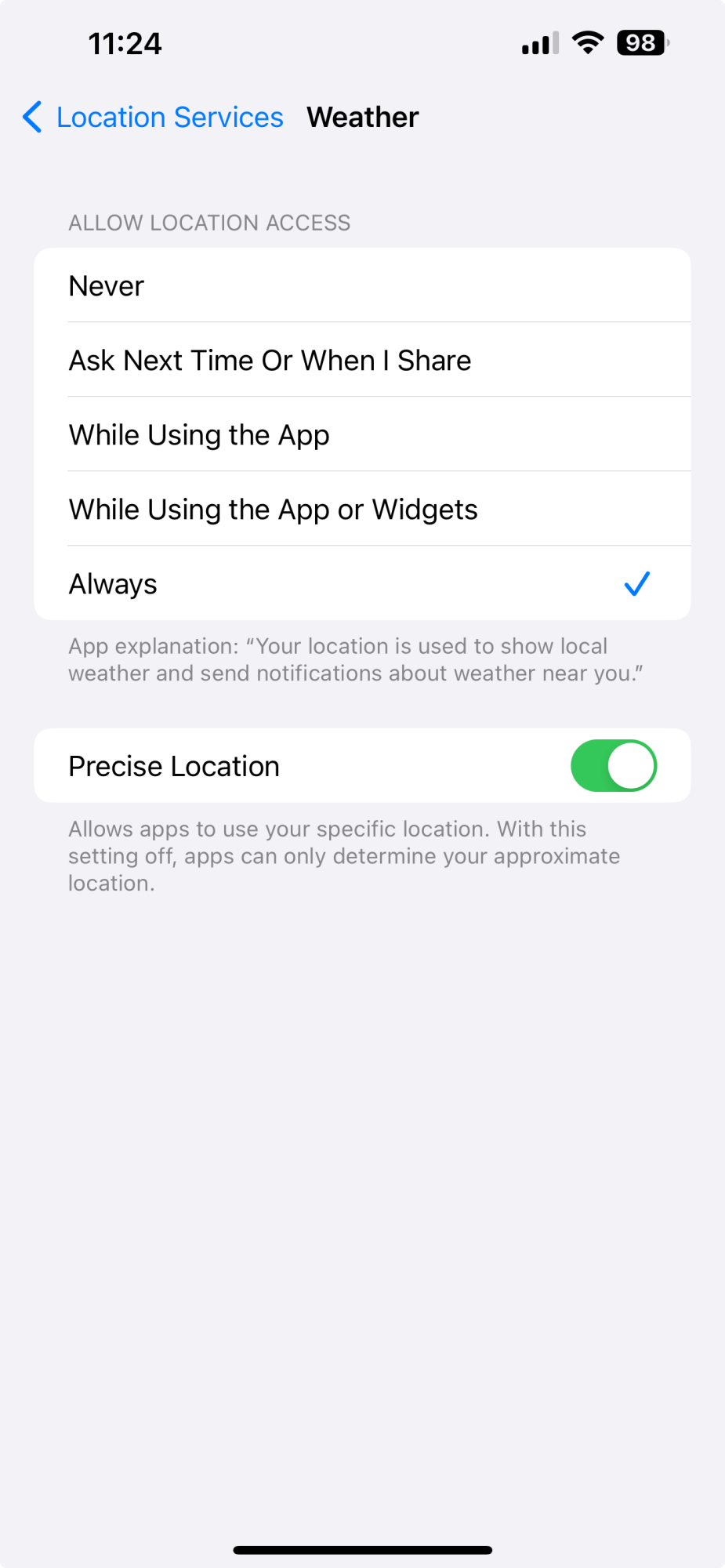 Tried this but I see no option for “always”…only “never”, “ask next time…”, or “while using app”.This option somewhat modified worked for me using a AW Ultra Gen 1: