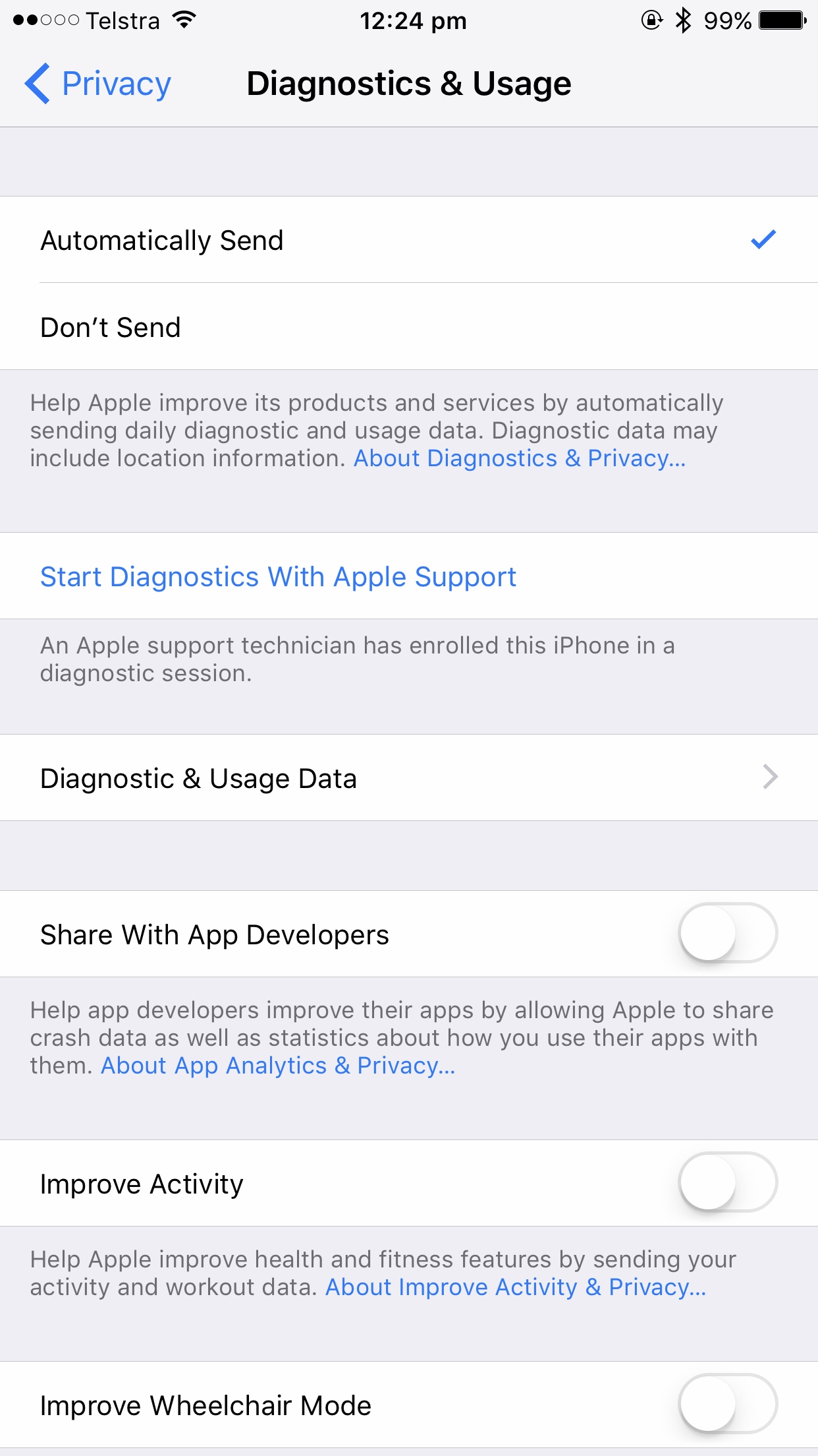 But unfortunately the "start diagnostics with apple support" is still there in my settings and he can't get rid of it.