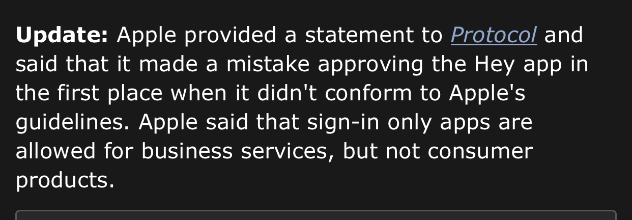 To provide another Apple example, if Hey wanted to distribute a Mac app they'd be able to do so without having to implement in-app purchases, outside of the app store.
